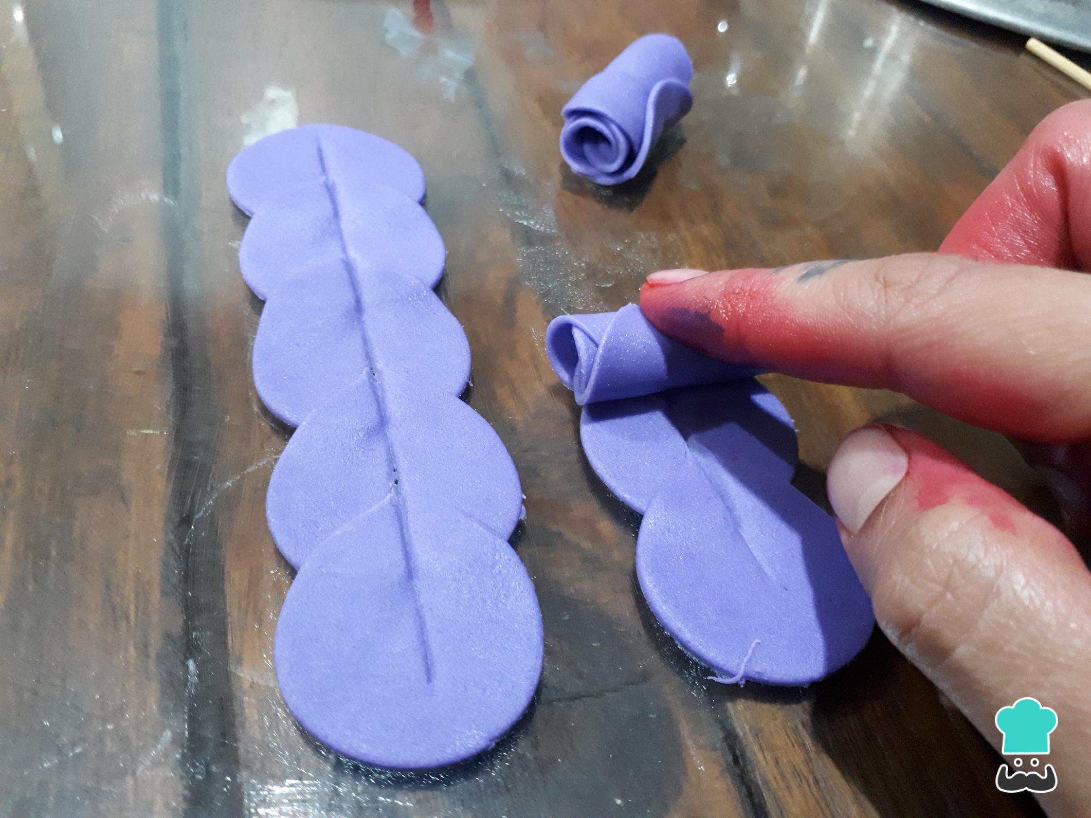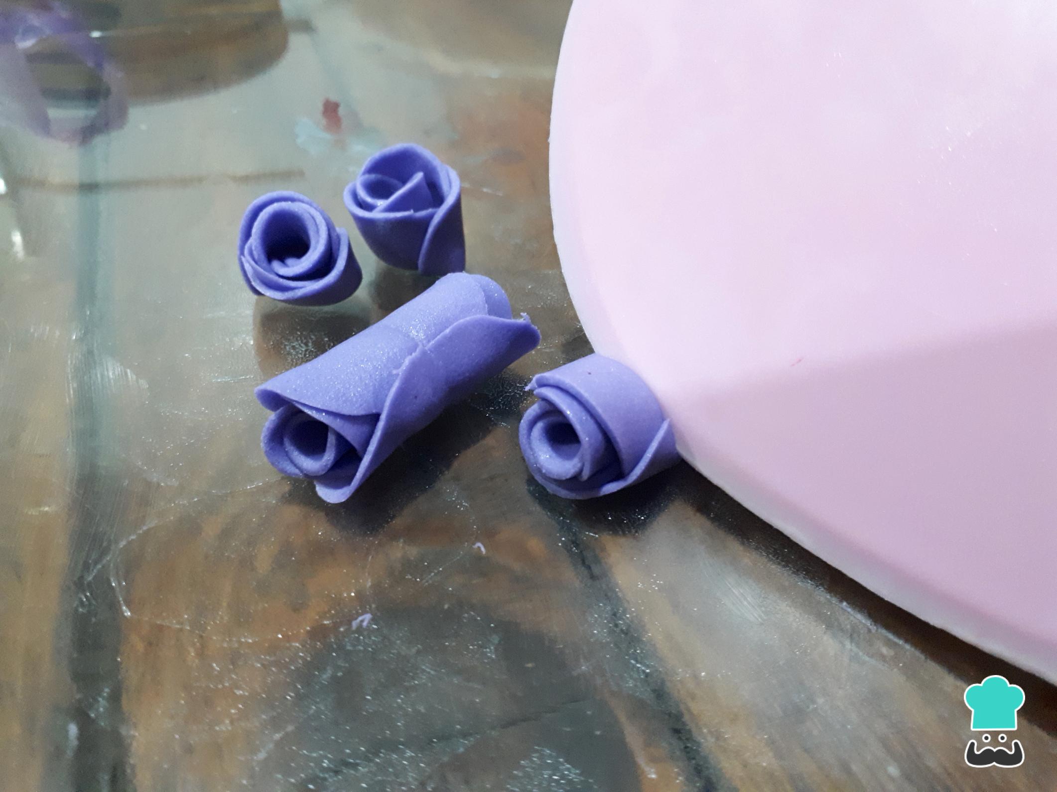 Truco: Si el fondant está muy seco puedes darle unas pinceladas con agua para que las flores se peguen bien y no se deformen.