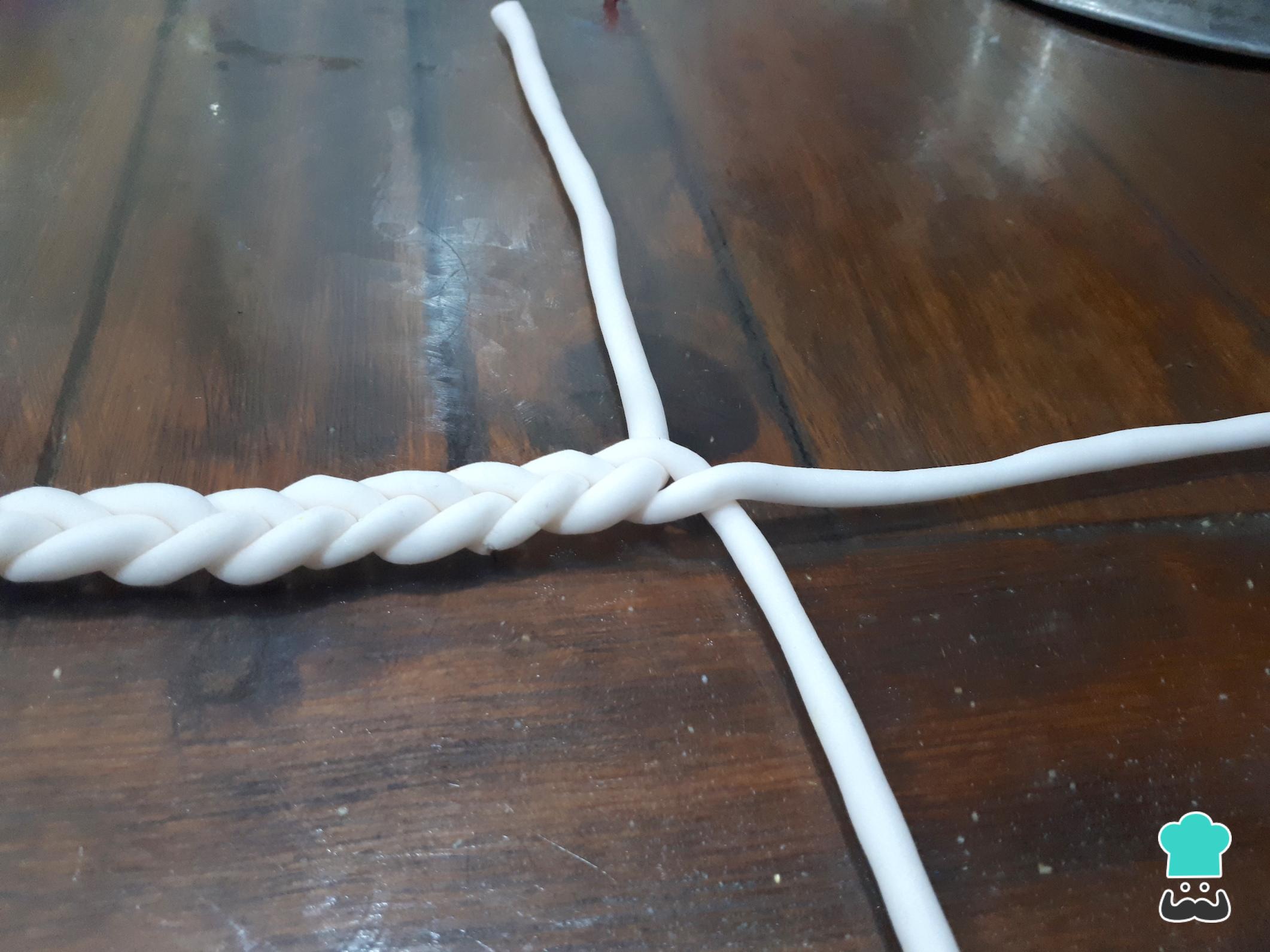 Para hacer el asa de la canasta de la tarta fondant para el Día de la Madre, forma tres tiras delgadas y largas de fondant blanco y únelas a manera de trenza. No olvides dar unas pinceladas de agua al fondant para que las decoraciones queden bien pegadas.