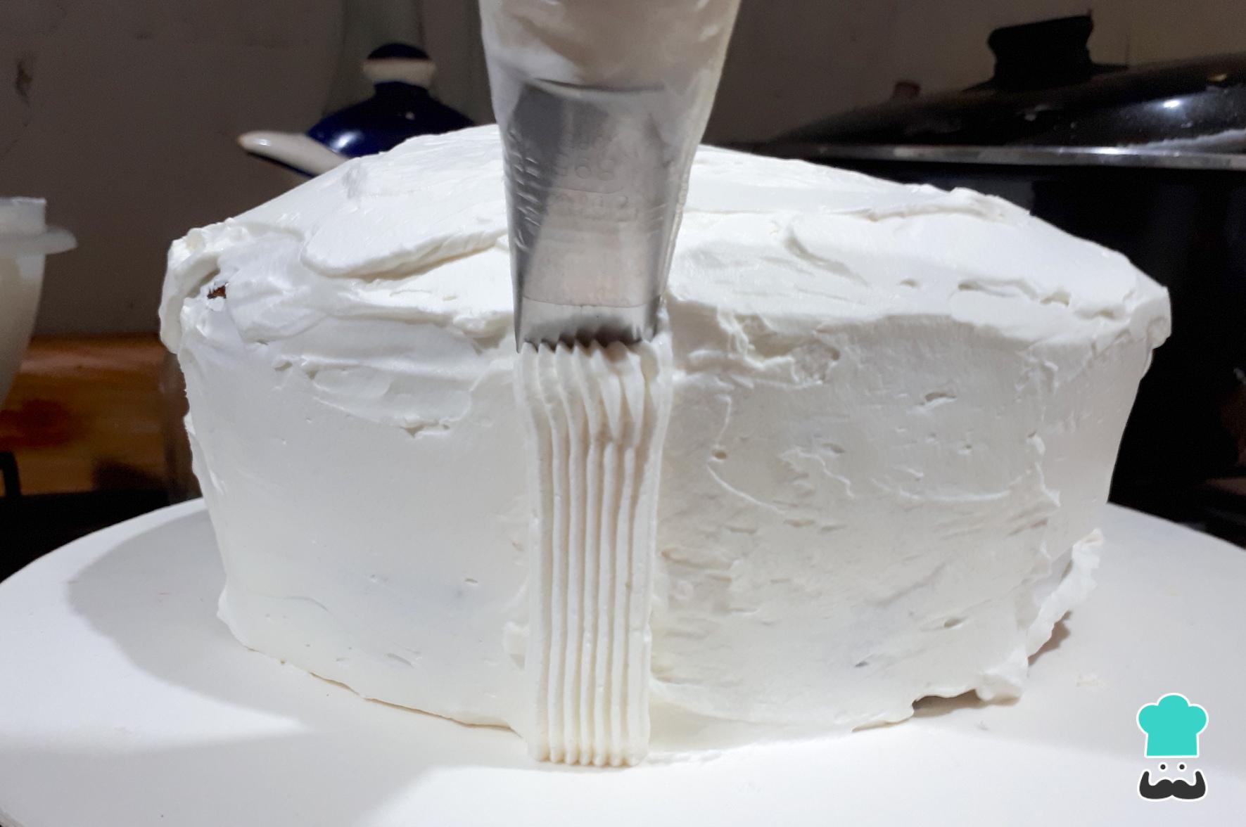Cubre la torta para el Día de la Madre con la nata montada y alisa por completo. Yo utilice una receta de torta sencilla de vainilla y esencia de coco para saborizar la nata, pero tú puedes usar la que más te convenga.