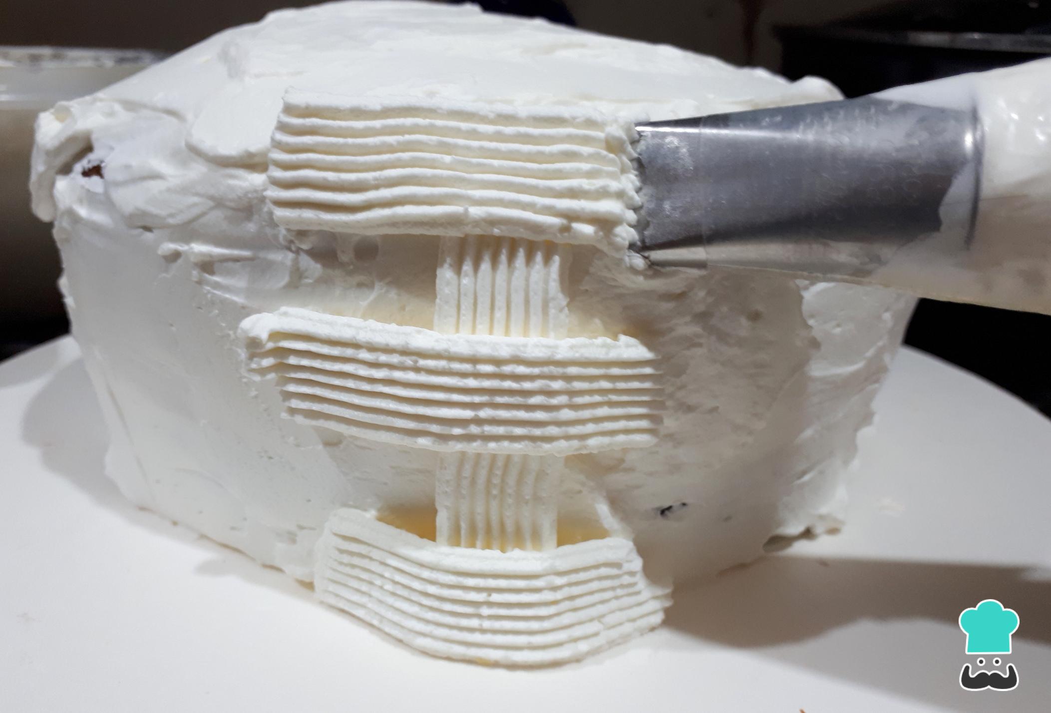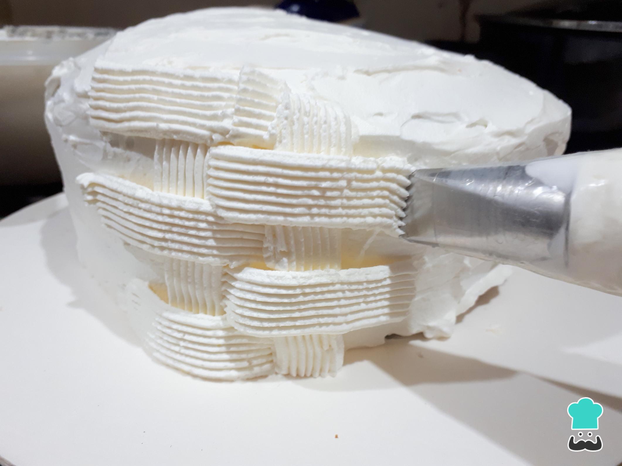 Para formar la canasta, traza una línea vertical con más nata montada y utilizando una duya (o manga pastelera) plana.