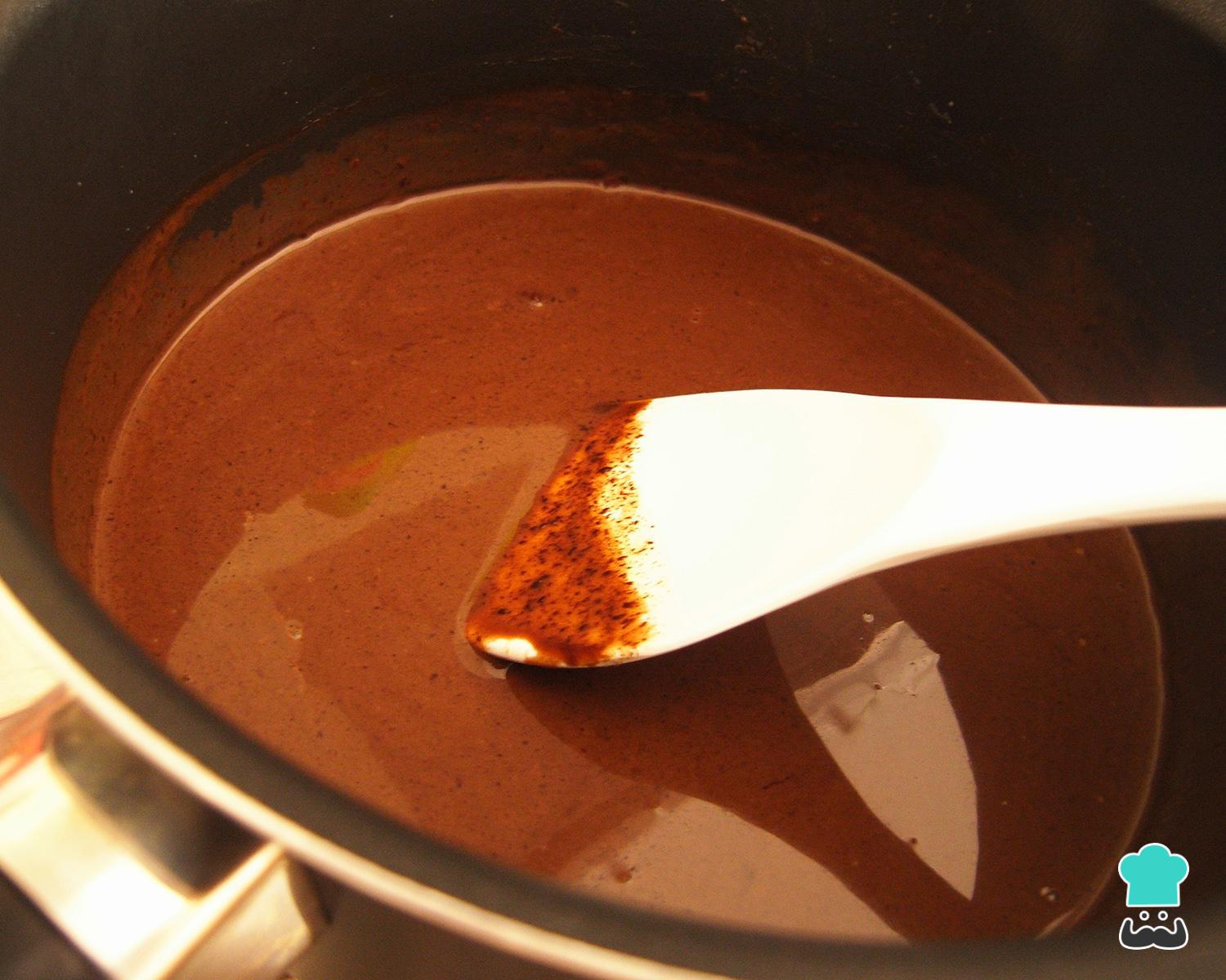 Empezamos preparando la crema de la tarta helada. Para ello, calentamos en un cazo el chocolate y la leche condensada, revolviendo constantemente hasta que se integren ambos ingredientes. Nosotros utilizamos chocolate en polvo, pero también se puede emplear chocolate sólido.
