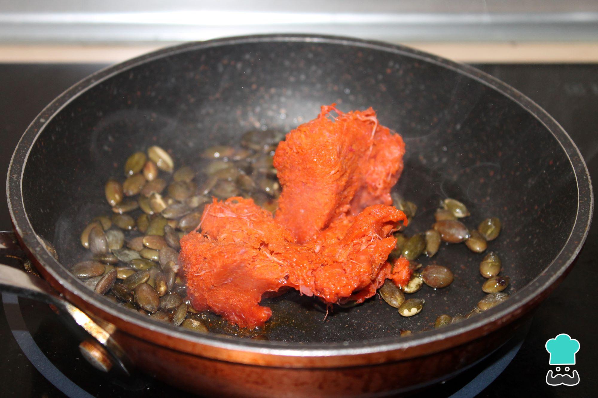 A continuación, incorpora la sobrasada. Debes remover bien para que se caliente y, a la vez, se integre con las pipas de calabaza.