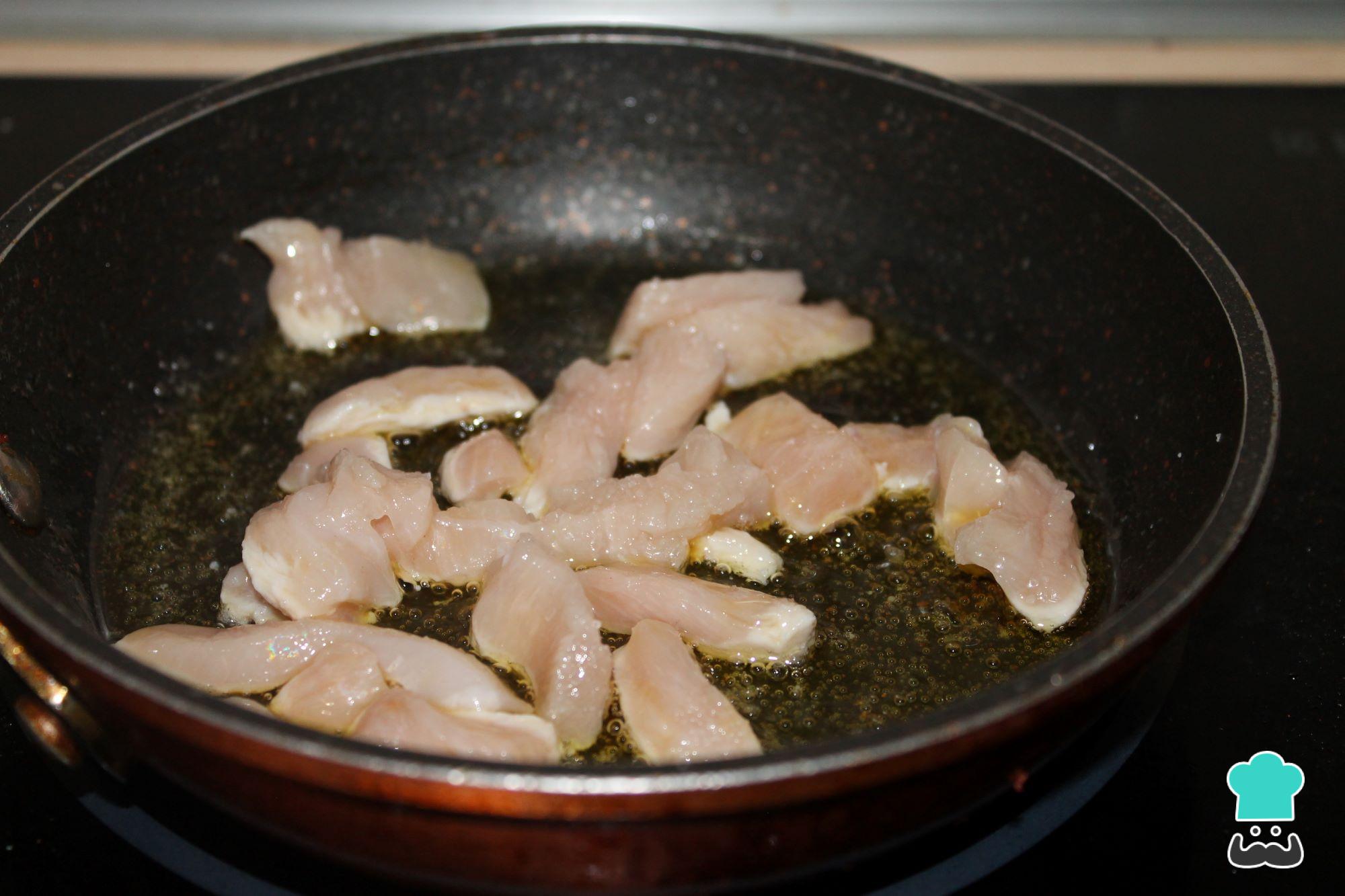 Finalizaremos preparando las tartaletas de pollo y piña. Primero, debes trocear los filetes de pechuga de pollo en tiras muy finas, puedes hacerlo con unas tijeras para que quede un corte más fino y pequeño. Luego, pon la cucharada de postre de aceite en una sartén al fuego y cuando esté caliente sofríe los trozos de pechuga en él. En caso de ser necesario, es el momento de añadir un poco de sal.
