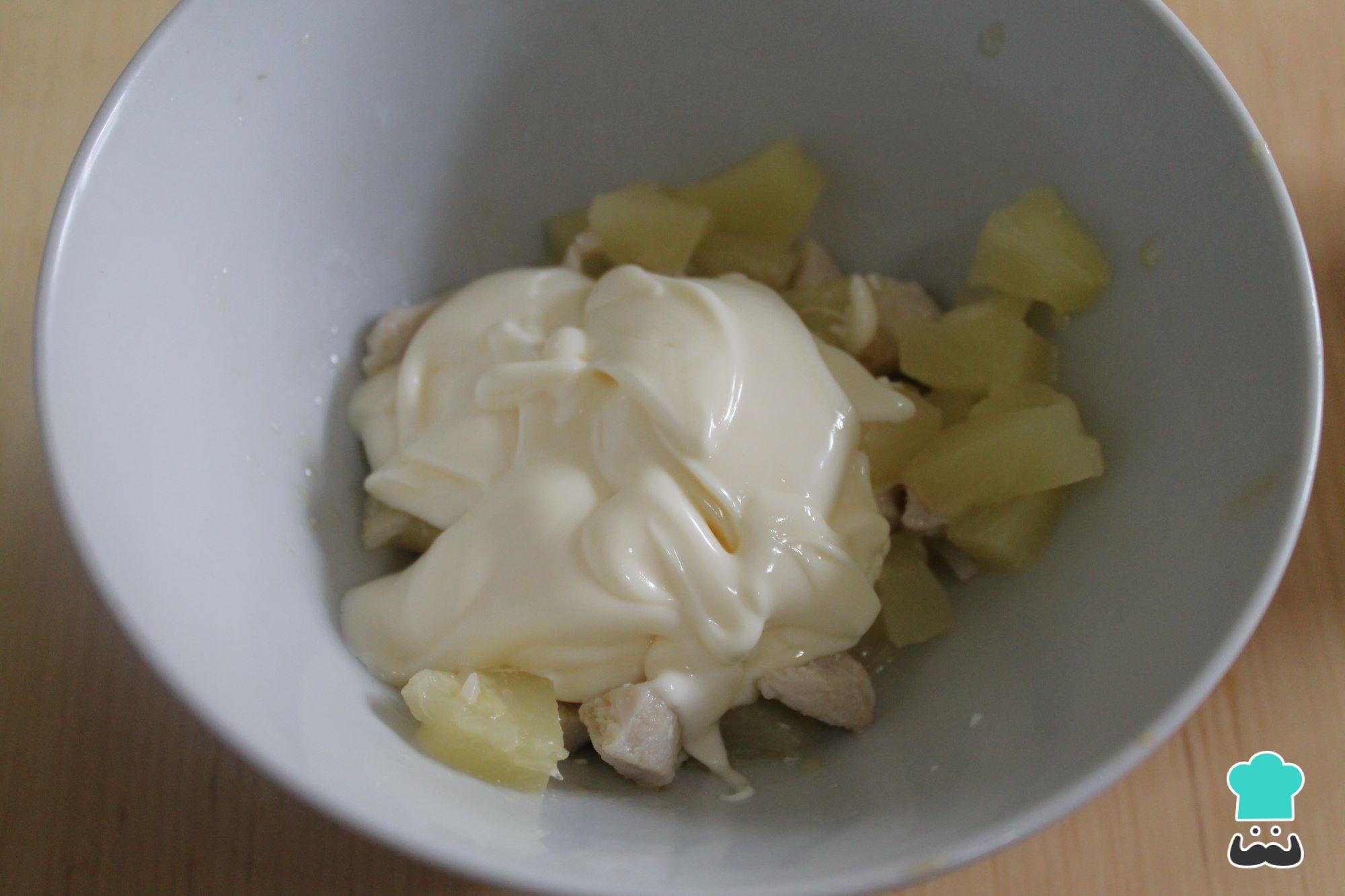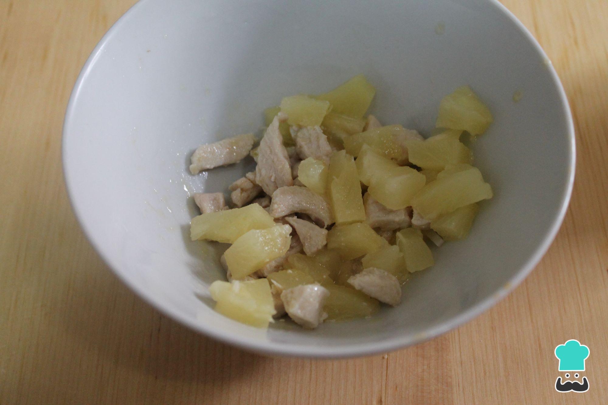 A continuación, debes trocear finamente los trozos de piña y ponerlos en un bol junto con la pechuga sofrita.