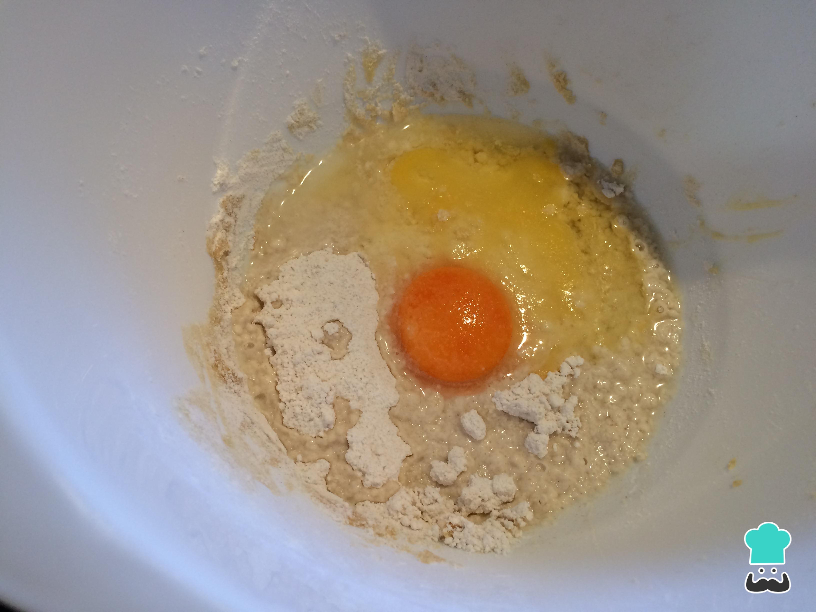 Para hacer la masa, mezclar la harina con la sal y hacer un hueco en el centro. Agrega el agua tibia, el huevo y la mantequilla derretida, mezclar muy bien todo hasta obtener una masa suave y elástica.