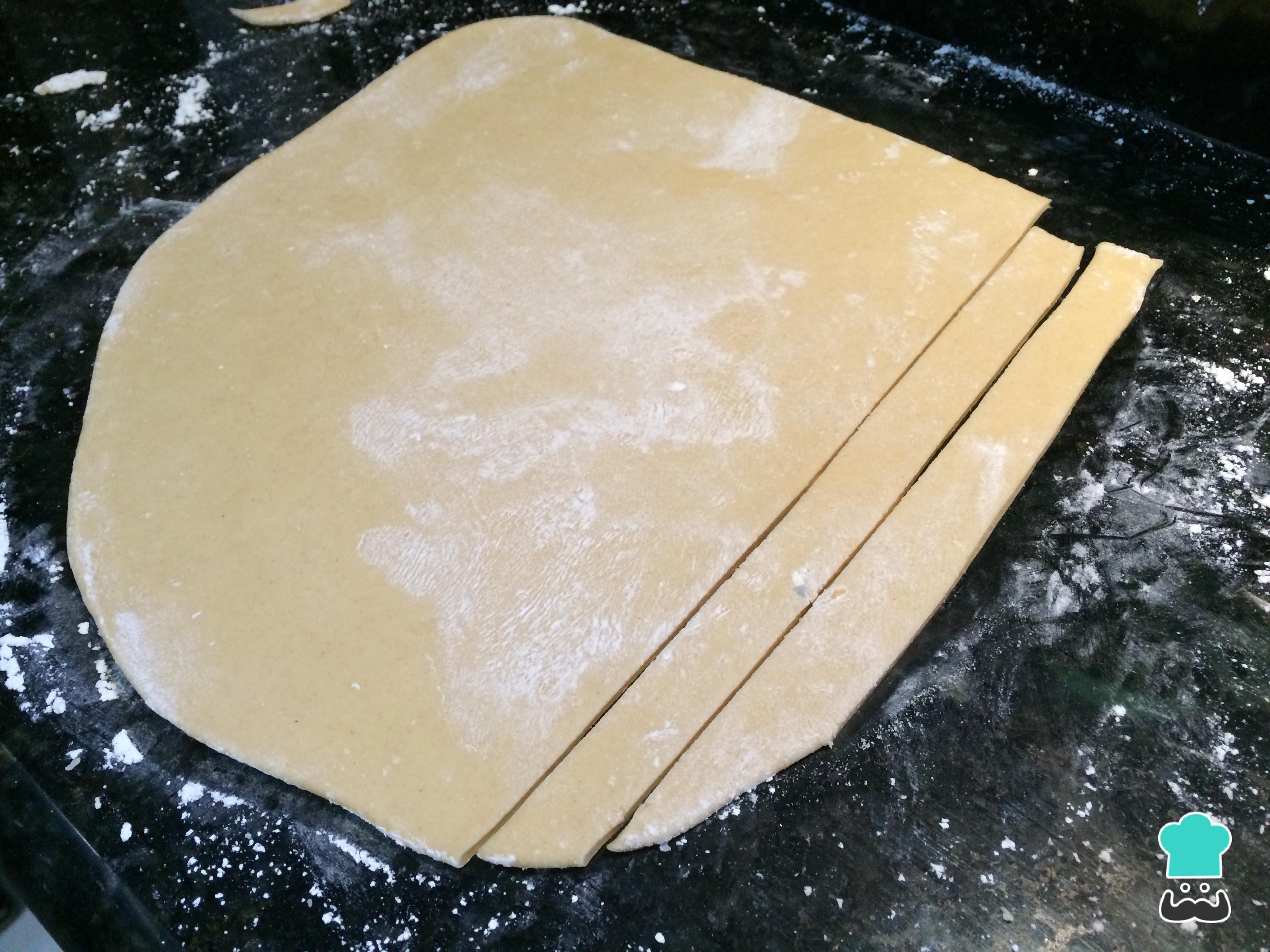 En una superficie con harina, estirar la masa sin gluten hasta que este delgada y cortar tiras de 2 cm de ancho.