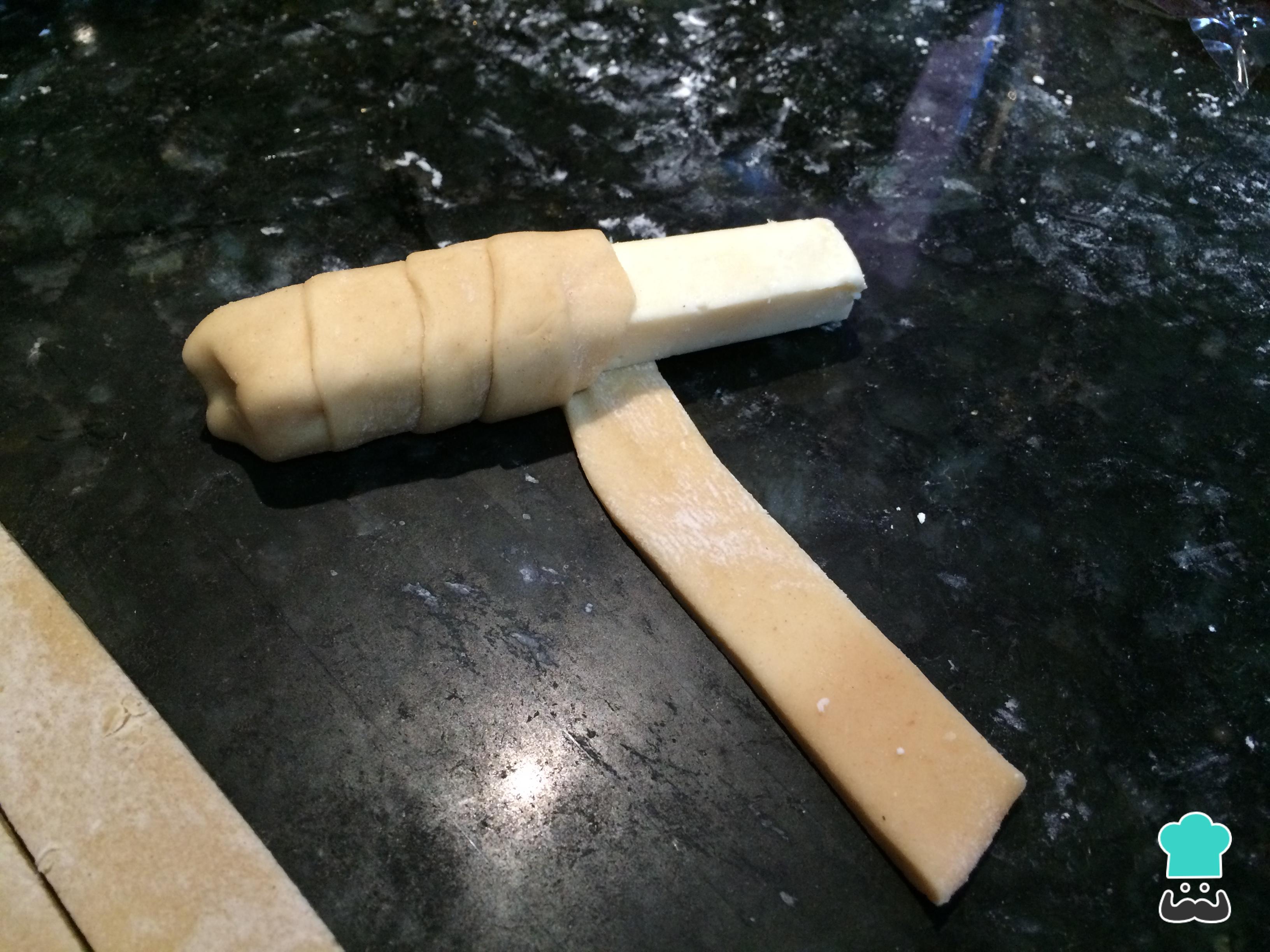 Cortar tiras de queso para enrollar con las cintas de masa hasta que estén muy compactas.