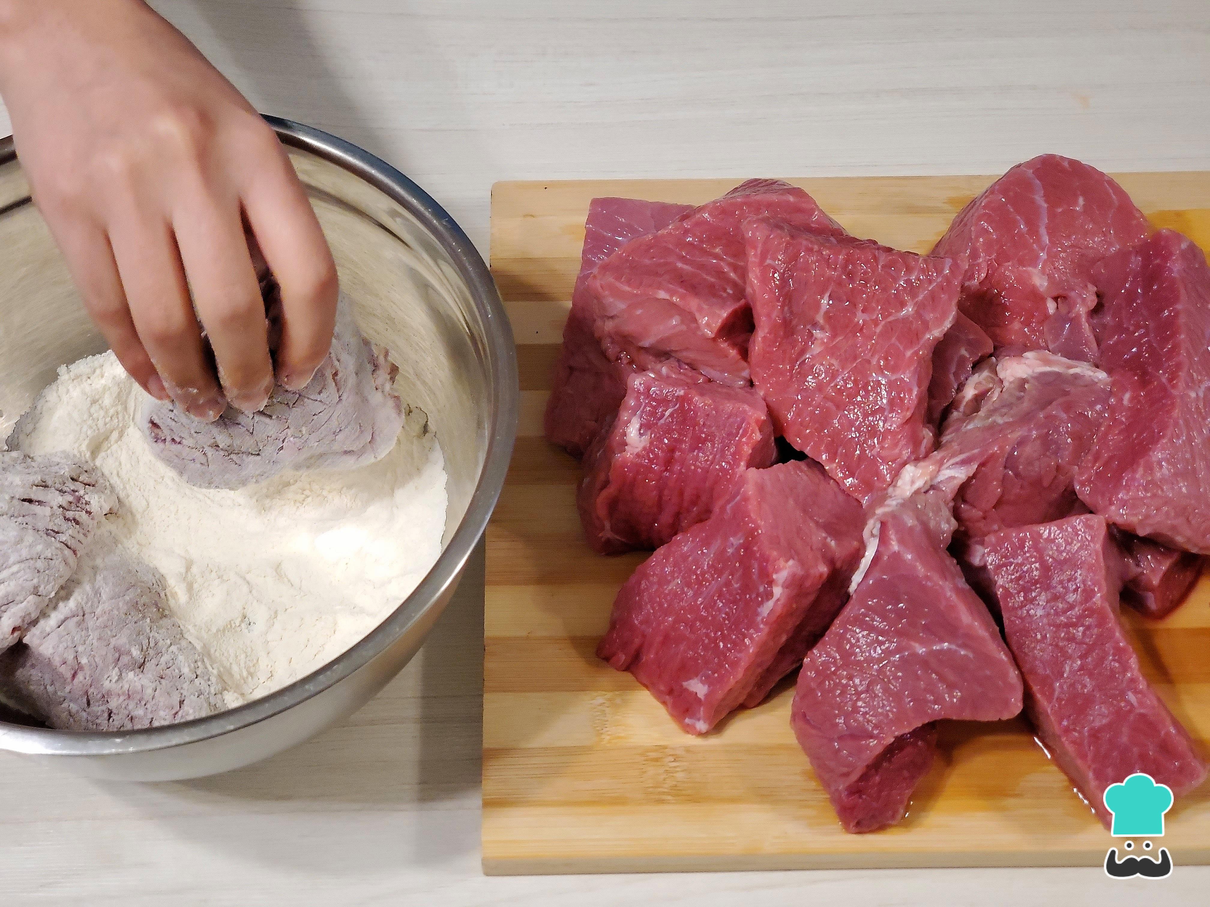Comienza limpiando los trozos de carne, es decir, retira cualquier tipo de grasa o nervios. También corta las piezas por la mitad si son muy grandes. Cuando los tengas limpios, coloca en un bowl un par de cucharadas de harina y procede a enharinarlas una por una.