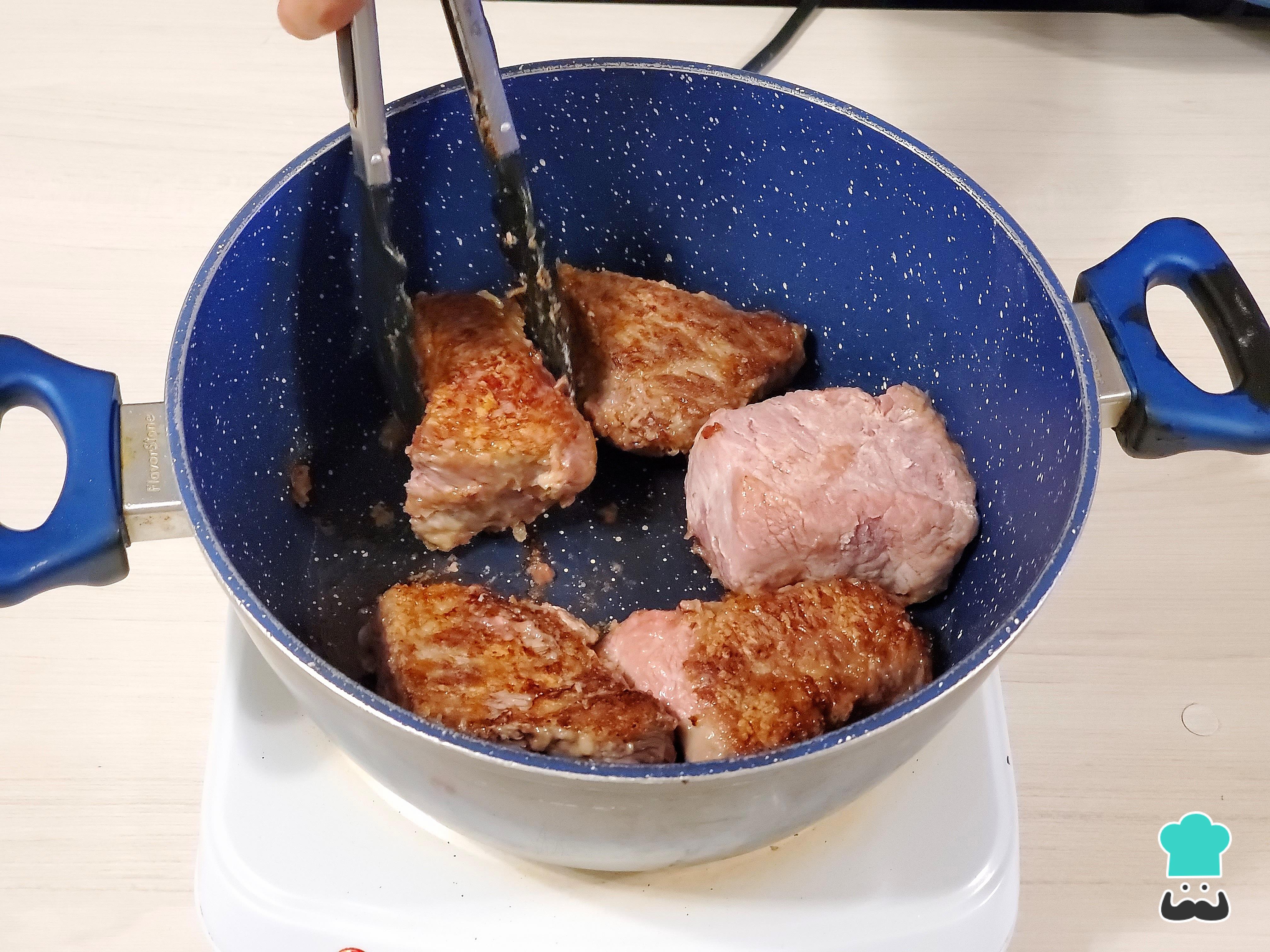 Seguidamente, calienta una olla grande y vierte un buen chorro de aceite de oliva. Cuando notes que el aceite está empezando a humear, con mucho cuidado introduce las carnes que quepan en la base para sellarlas. Luego, dales vuelta para dorarlas por cada lado. Si son demasiados trozos de carne, séllalos en 2 o 3 tiempos. Reserva aparte.