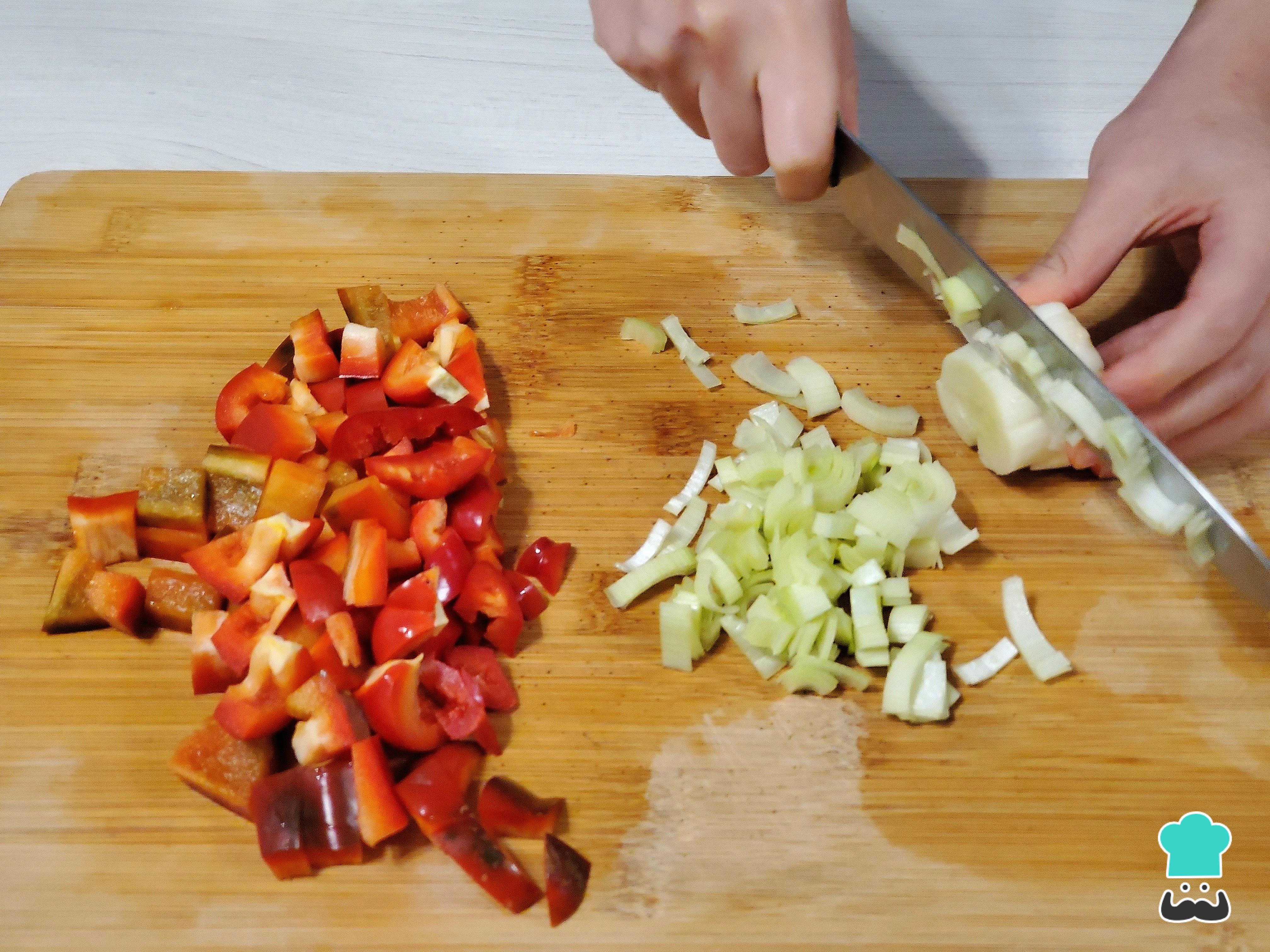 En otra tabla, corta los vegetales: cebollas, ajo, poro, pimiento, tomate y zanahorias en trozos medianos. Pueden ser cortes irregulares porque al final de la cocción se triturarán.