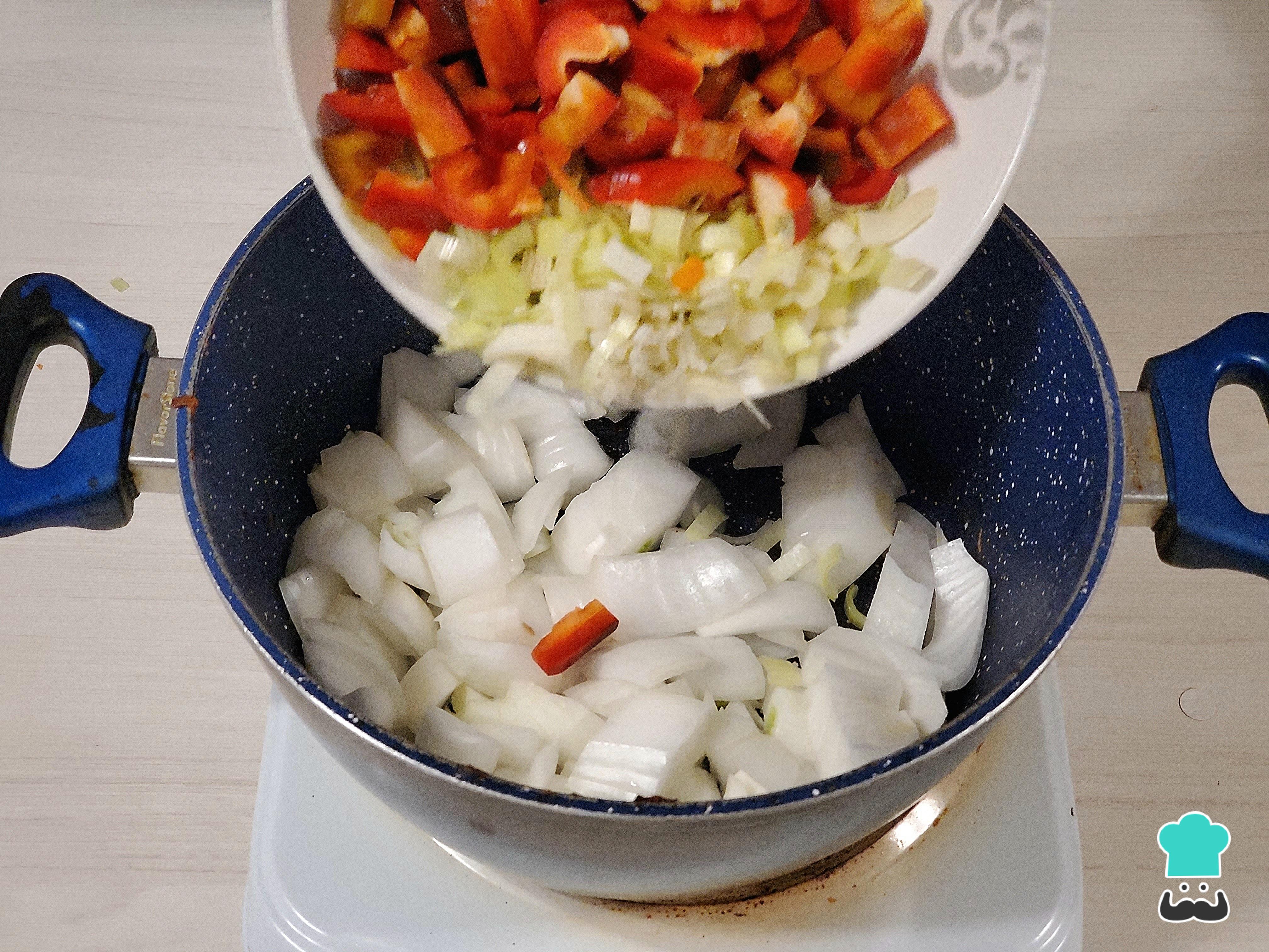 A continuación, vuelve a calentar la olla donde se selló la carne y vuelca la cebolla, el ajo, el poro y el pimiento. Sofríe durante un par de minutos moviendo esporádicamente, notarás que los restos caramelizados en el fondo de la olla se despegan.