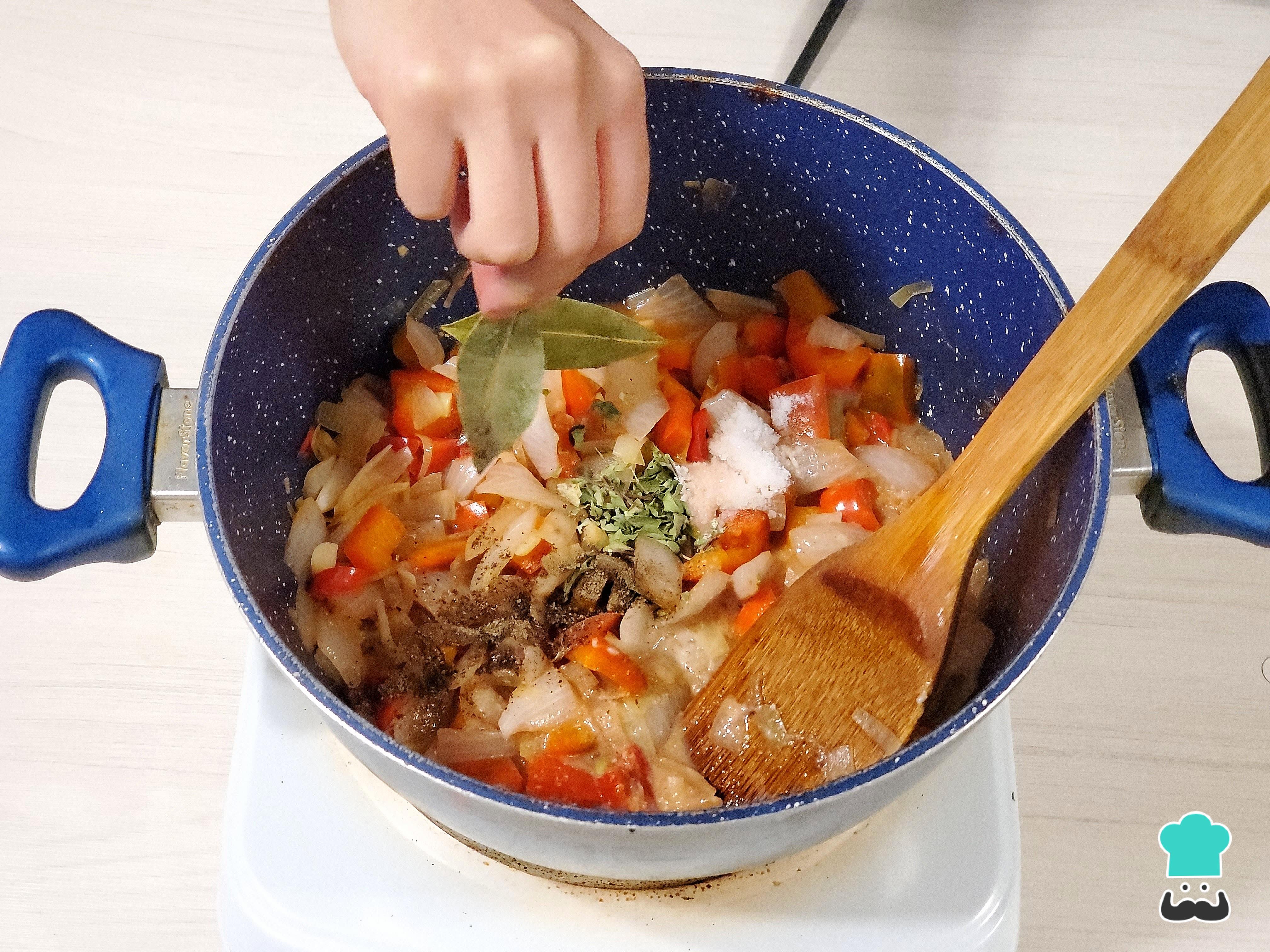 Seguidamente, incorpora las especias: orégano, romero, hojas de laurel, pimienta negra molida y sal.