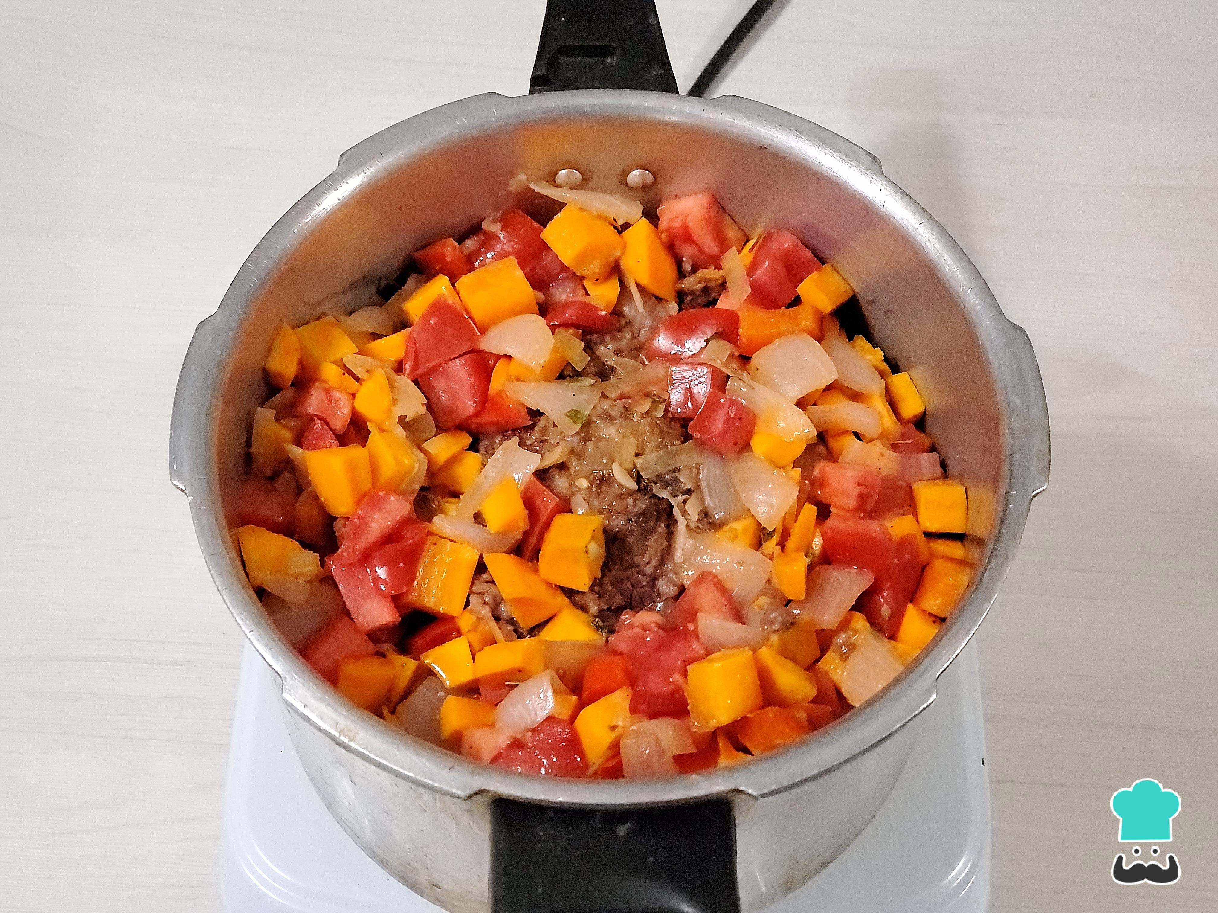 Remueve bien, incorpora la carne sellada, cubre con caldo o agua, tapa y deja hervir a fuego bajo por 1 hora y media.