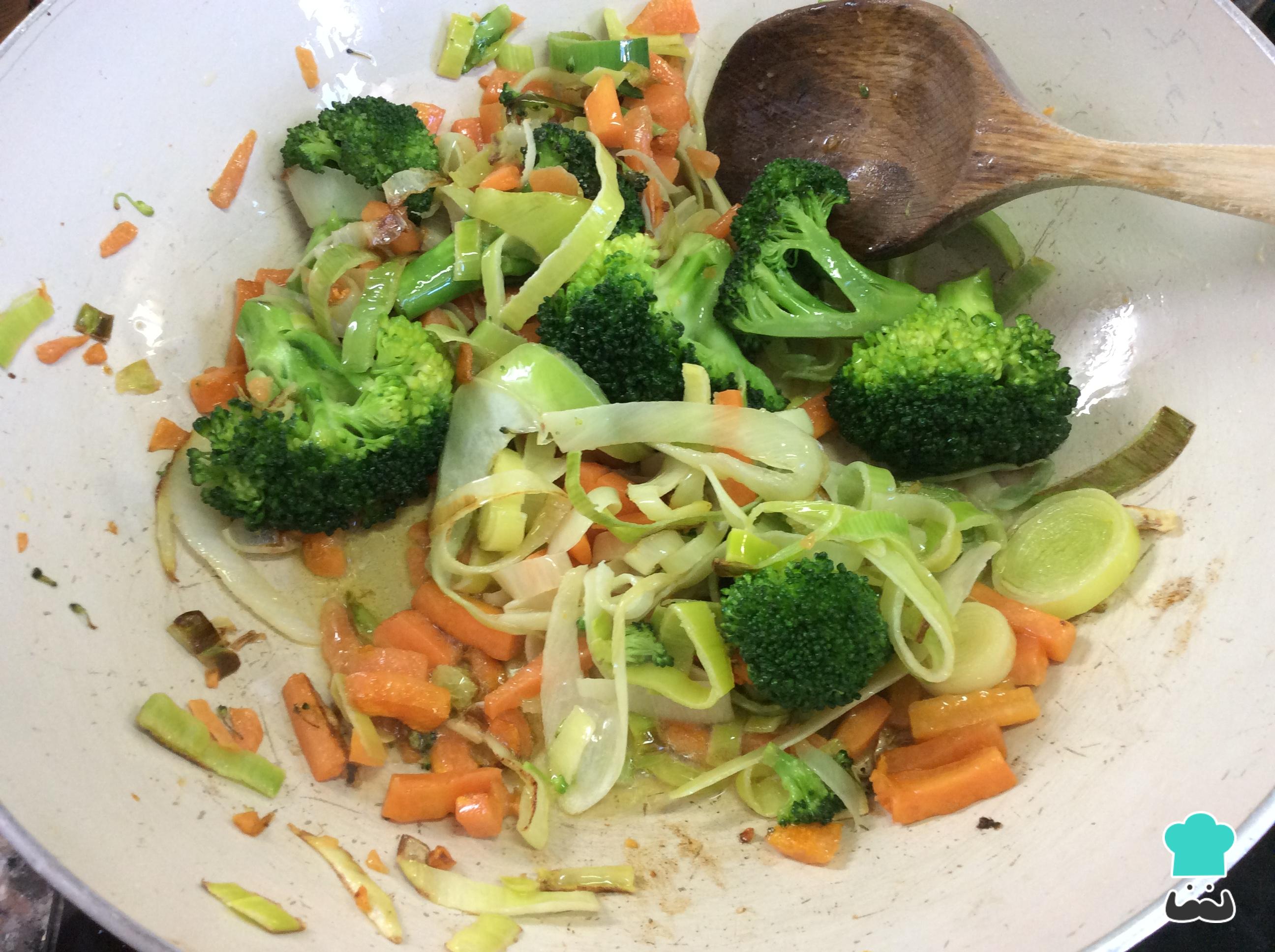 Para preparar la ternera estofada en muchas recetas se aconseja freír antes la ternera, luego reservarla y en la misma sartén sofreír las verduras. Esta receta es express: empezamos por las verduras, que sofreímos en una sartén con un chorro de aceite de oliva virgen extra. Tapamos la sartén para que se cocine antes, a modo de wok de verduras.