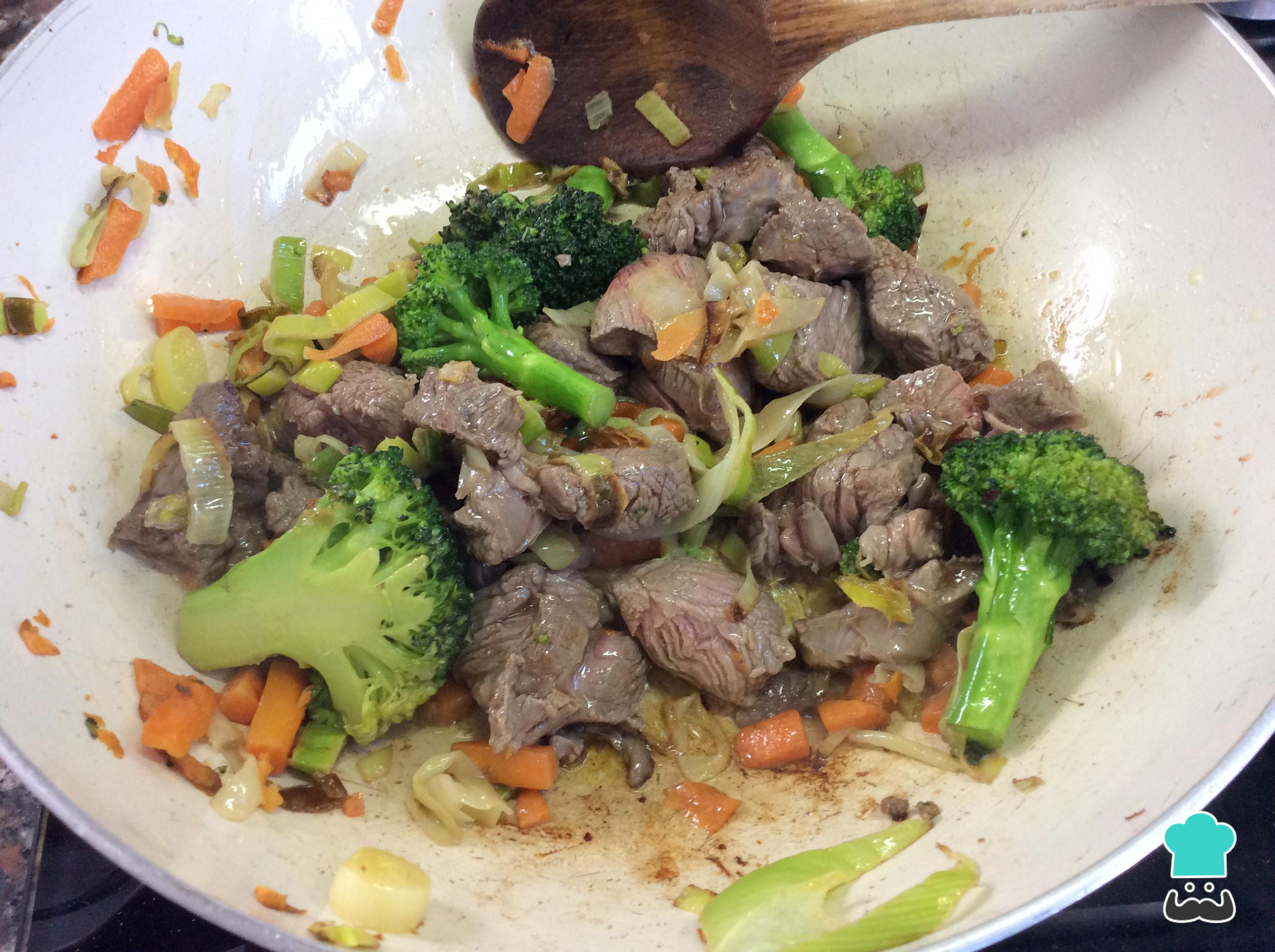 Cuando las verduras empiecen a estar tiernas, añadimos la ternera troceada. Removemos el conjunto y lo dejamos durante unos cinco minutos, hasta que la carne ya haya cogido color por todos lados.