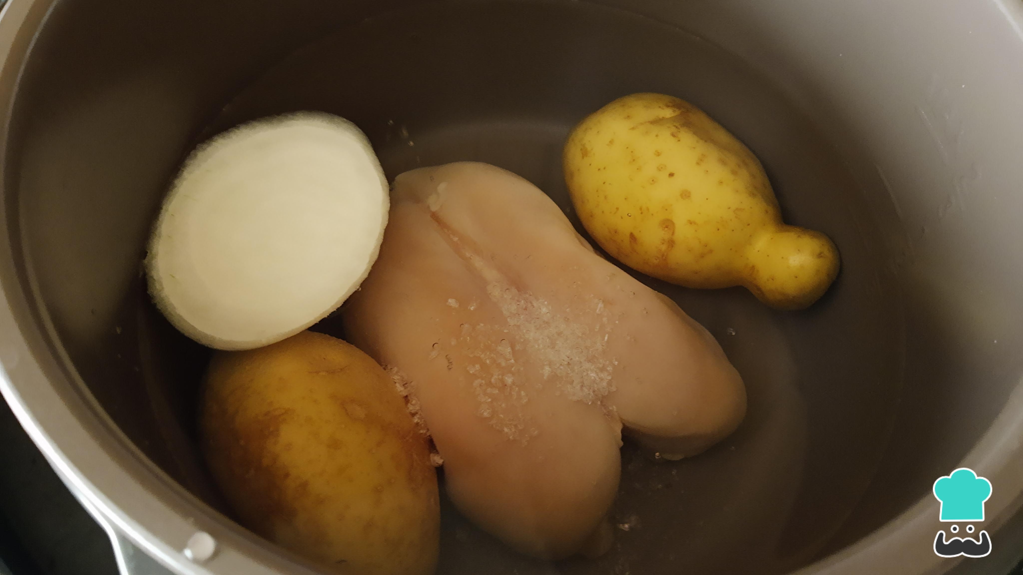Para comenzar la receta de tinga de pollo con papas, pon a cocer la pechuga de pollo limpia. Para ello, colócala en una olla con suficiente agua, un trozo de cebolla y una cucharadita de sal de grano. Puedes aprovechar para cocer también las papas en esta misma olla. Deja cocinar por 40 minutos en olla tradicional o 15 minutos en olla a presión desde que suelte el vapor.