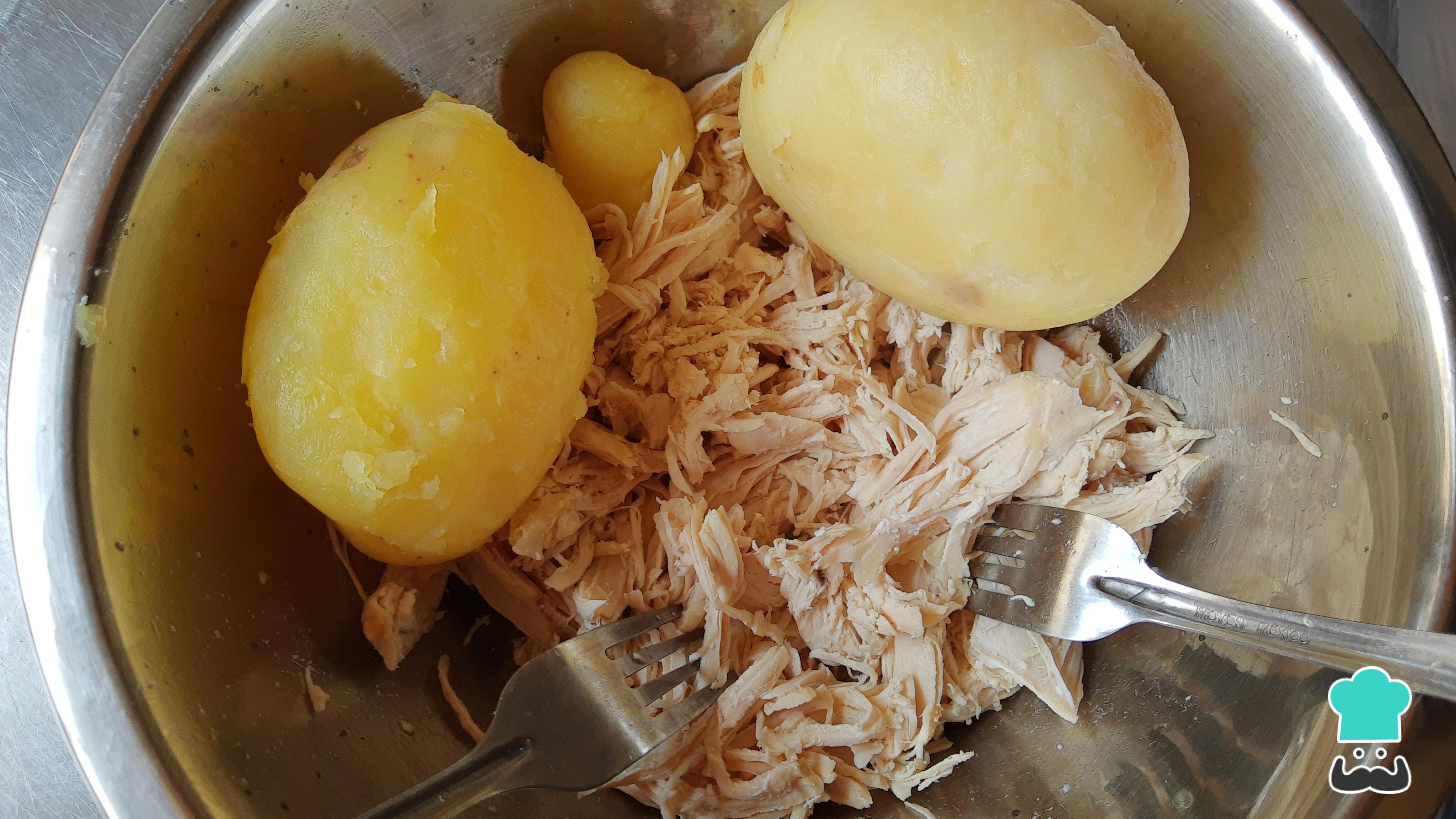 Pasado el tiempo de cocción, guarda el caldo de pollo para más adelante y desmenuza la pechuga de pollo con ayuda de un par de tenedores y resérvala. Retira la piel de las papas.