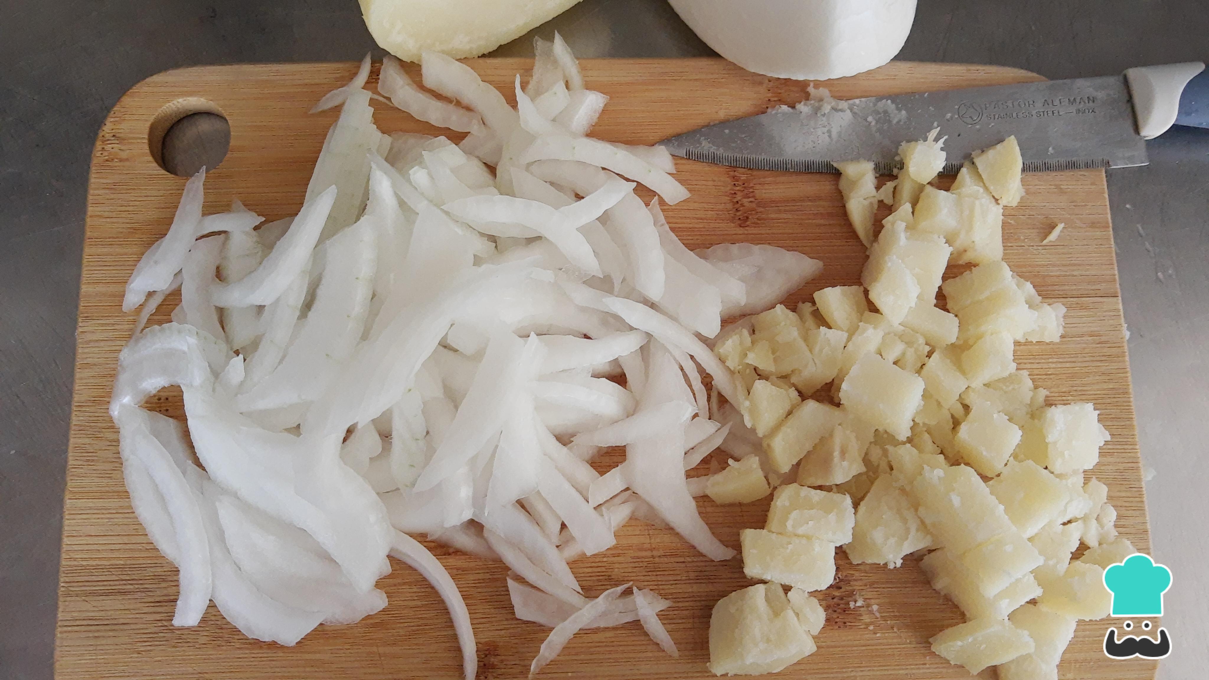 Corta en juliana la cebolla, en cubos o tiras las papas cocidas y reserva ambos ingredientes.