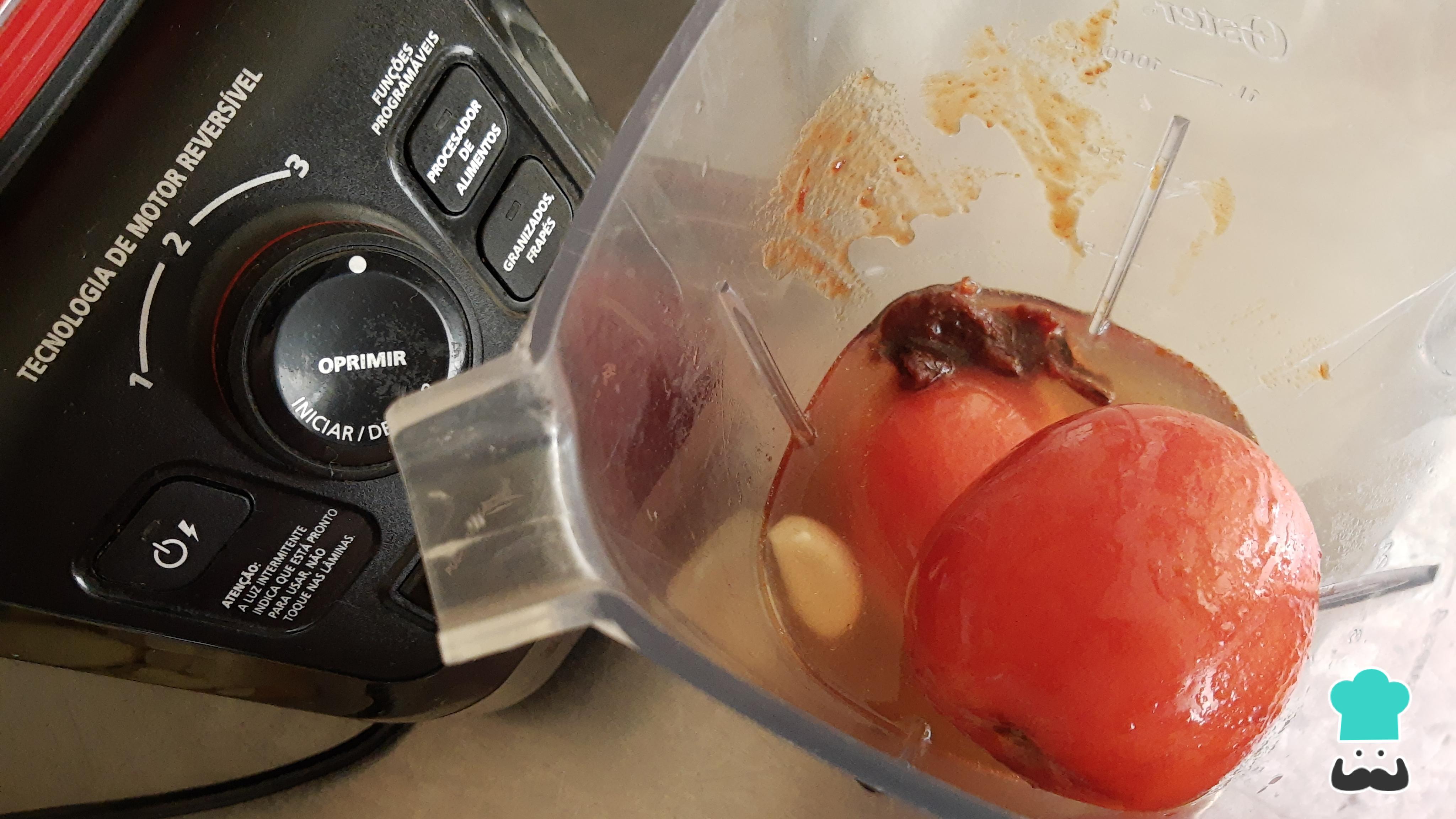 Para hacer la salsa de la tinga de pollo con papas, licua los jitomates, el diente de ajo, los chiles chipotle y una taza de caldo de pollo o agua. Tritura muy bien por unos 3 minutos.
