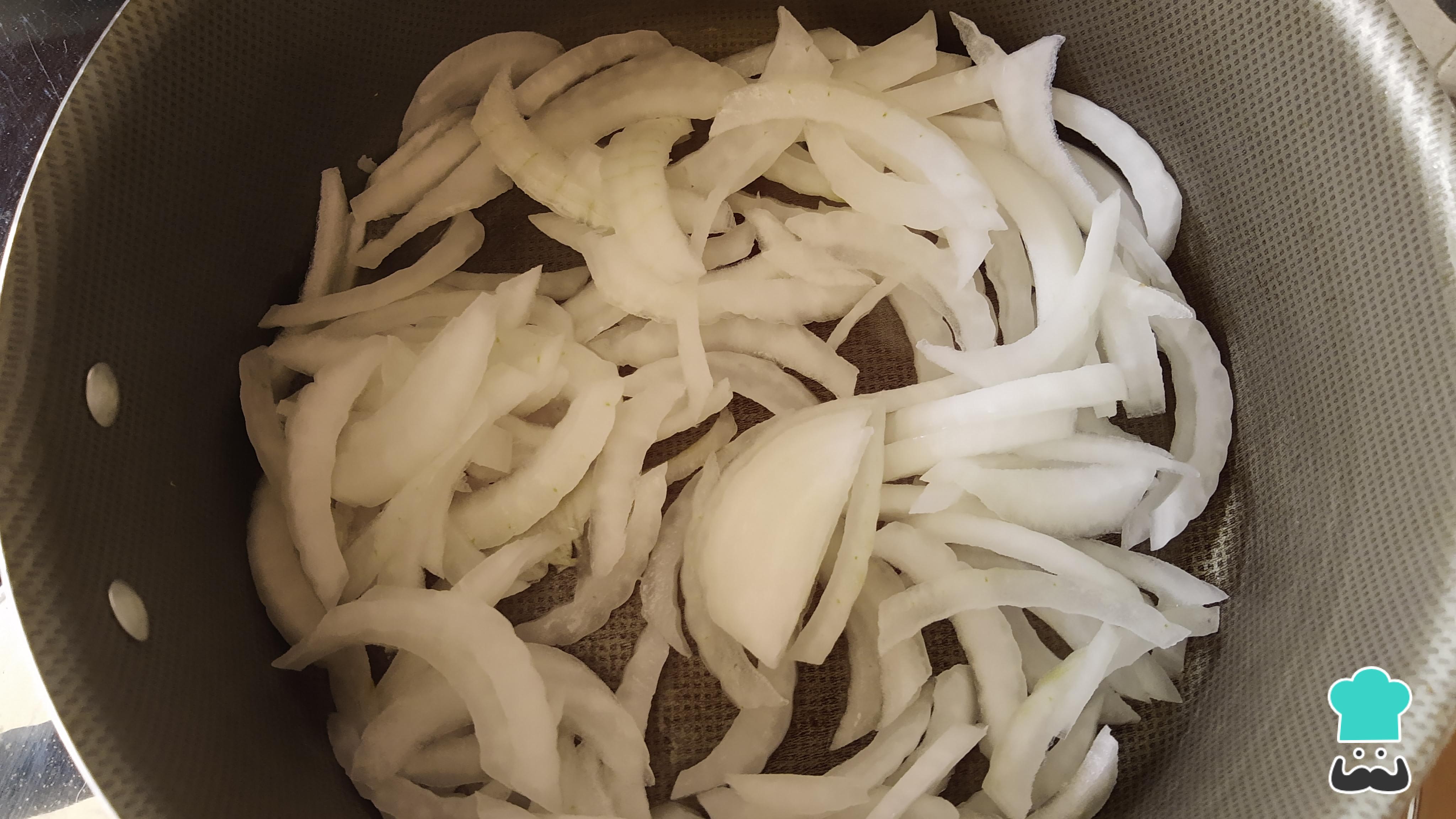 En una olla o sartén amplia, calienta una cucharada de aceite, agrega la cebolla y saltéala, moviéndola constantemente hasta que comience a cambiar de color a uno más transparente.