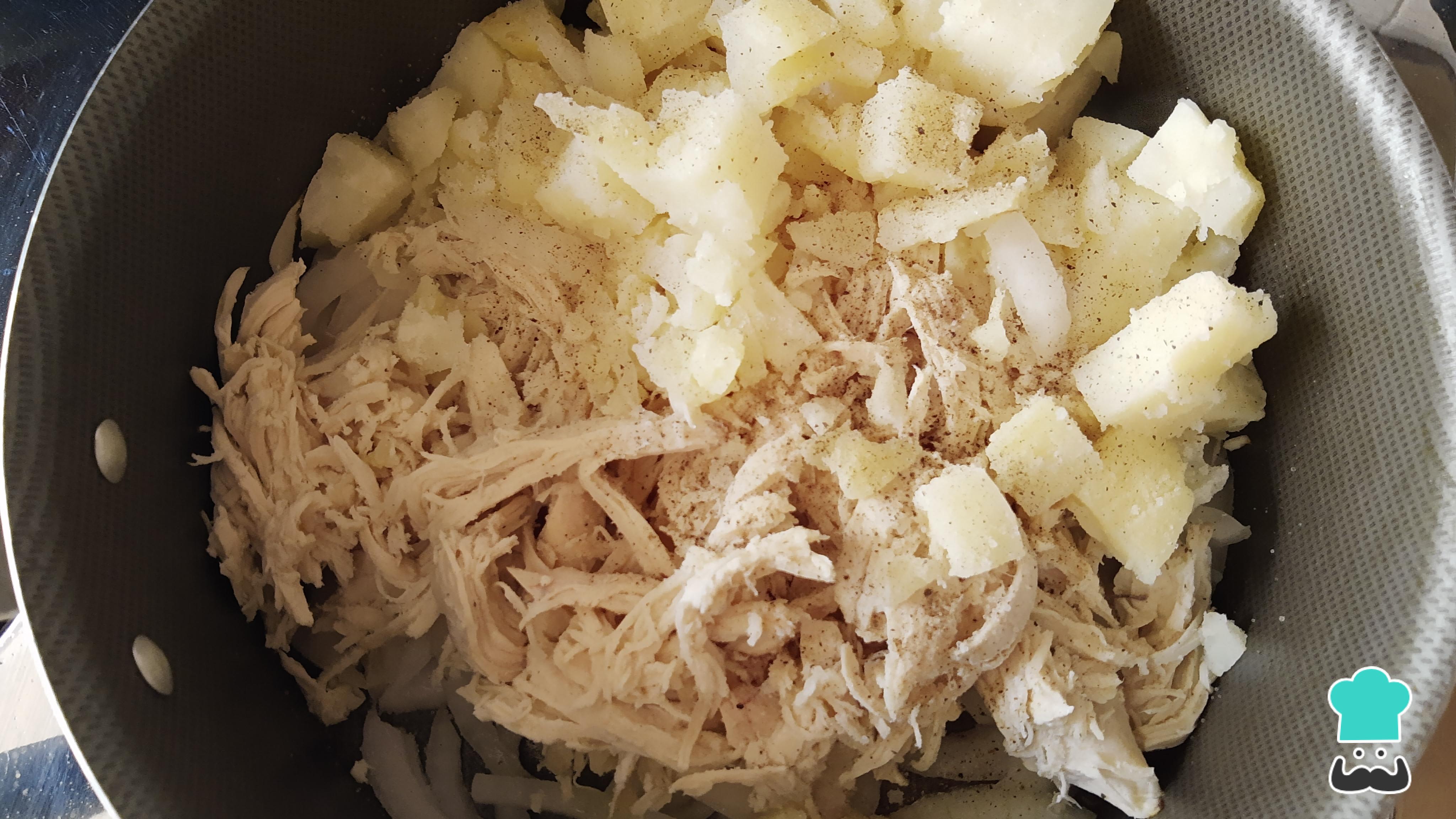 Incorpora el pollo desmenuzado y la papa picada.Agrega sal y pimienta al gusto y cocina por unos 3 minutos, moviendo constantemente para que no se queme la cebolla ni el pollo.