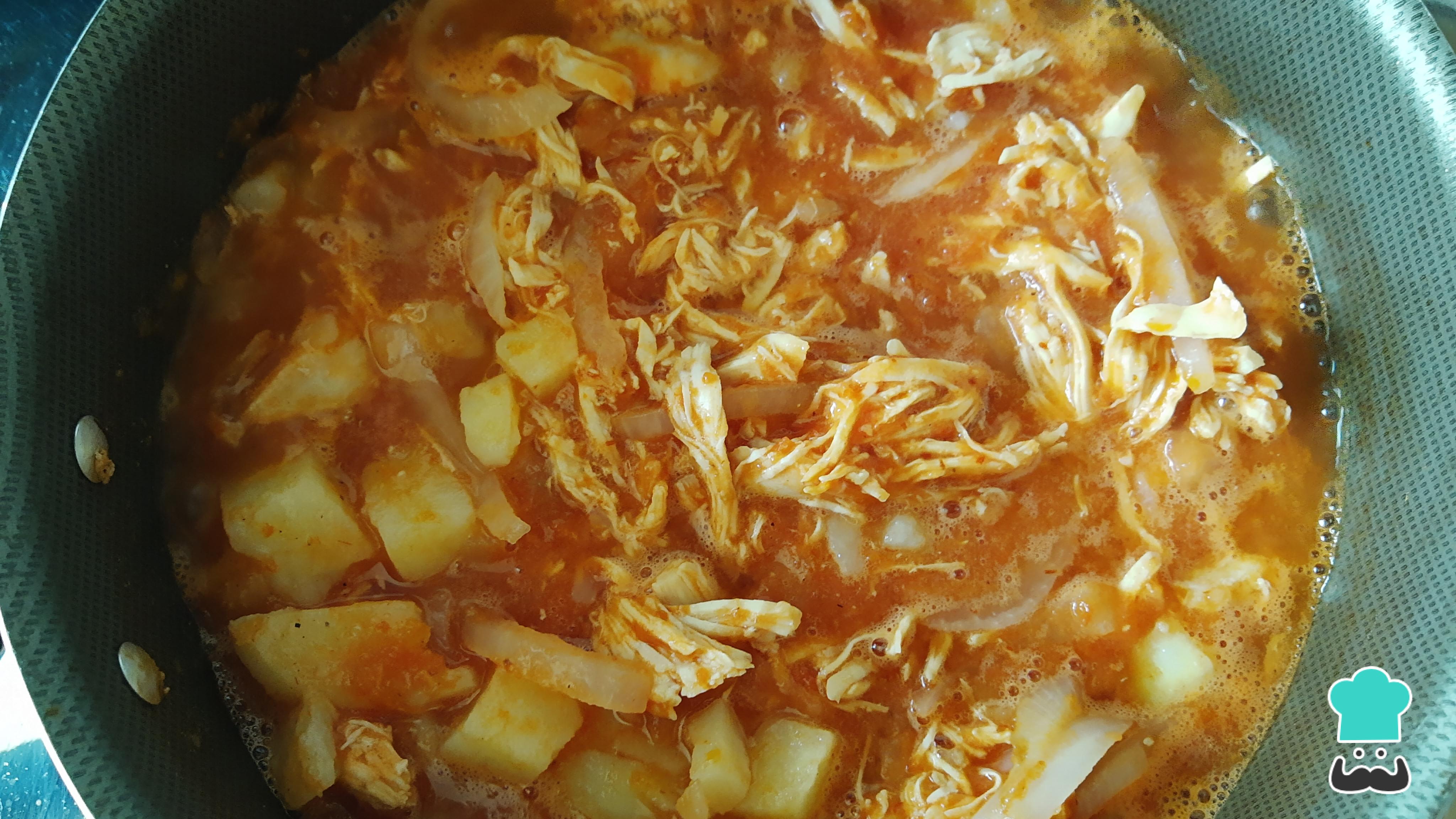 Truco: En este punto podrías añadir también chorizo picado si lo que deseas es preparar una rica receta de tinga de pollo con papa y chorizo.