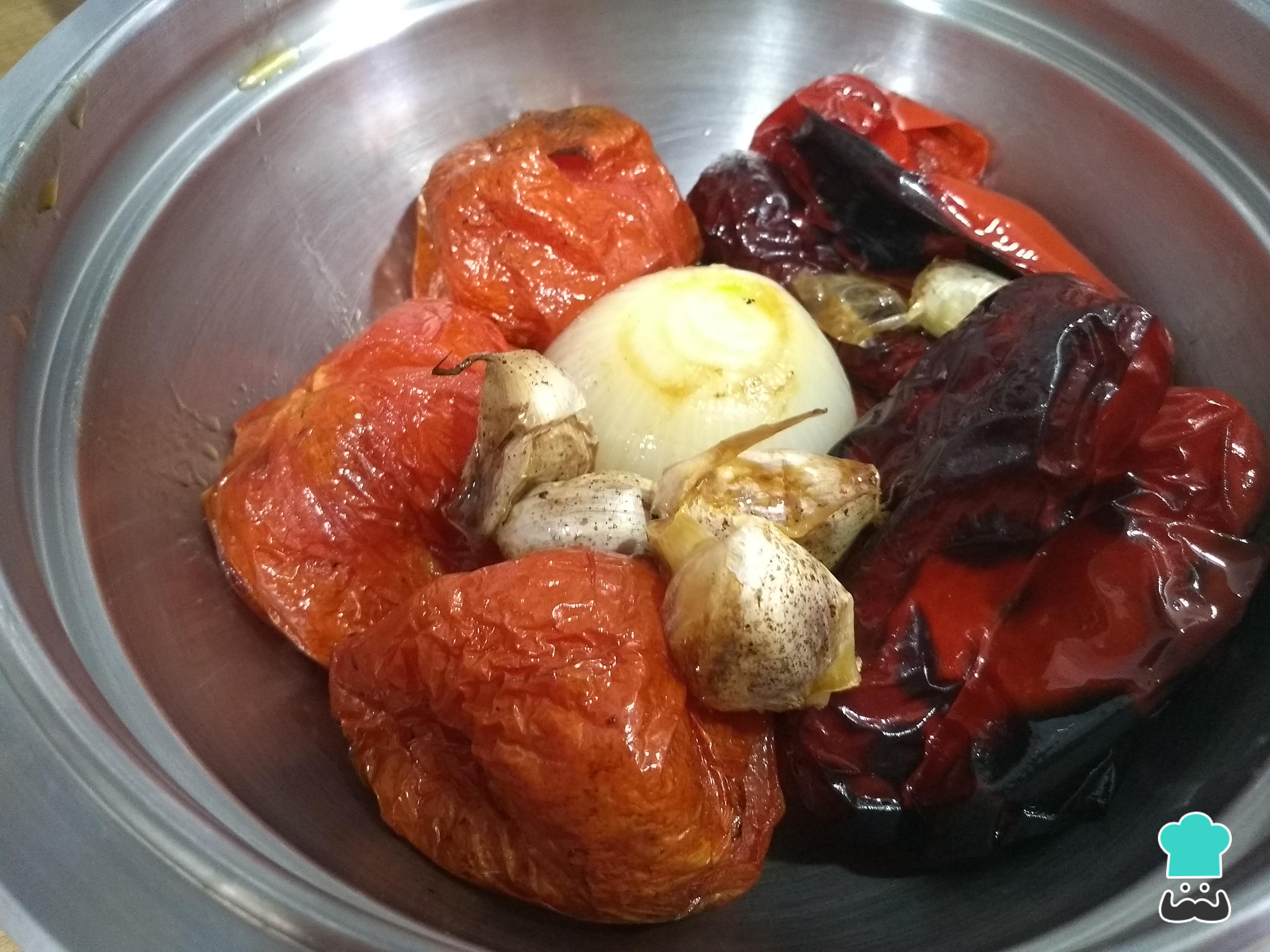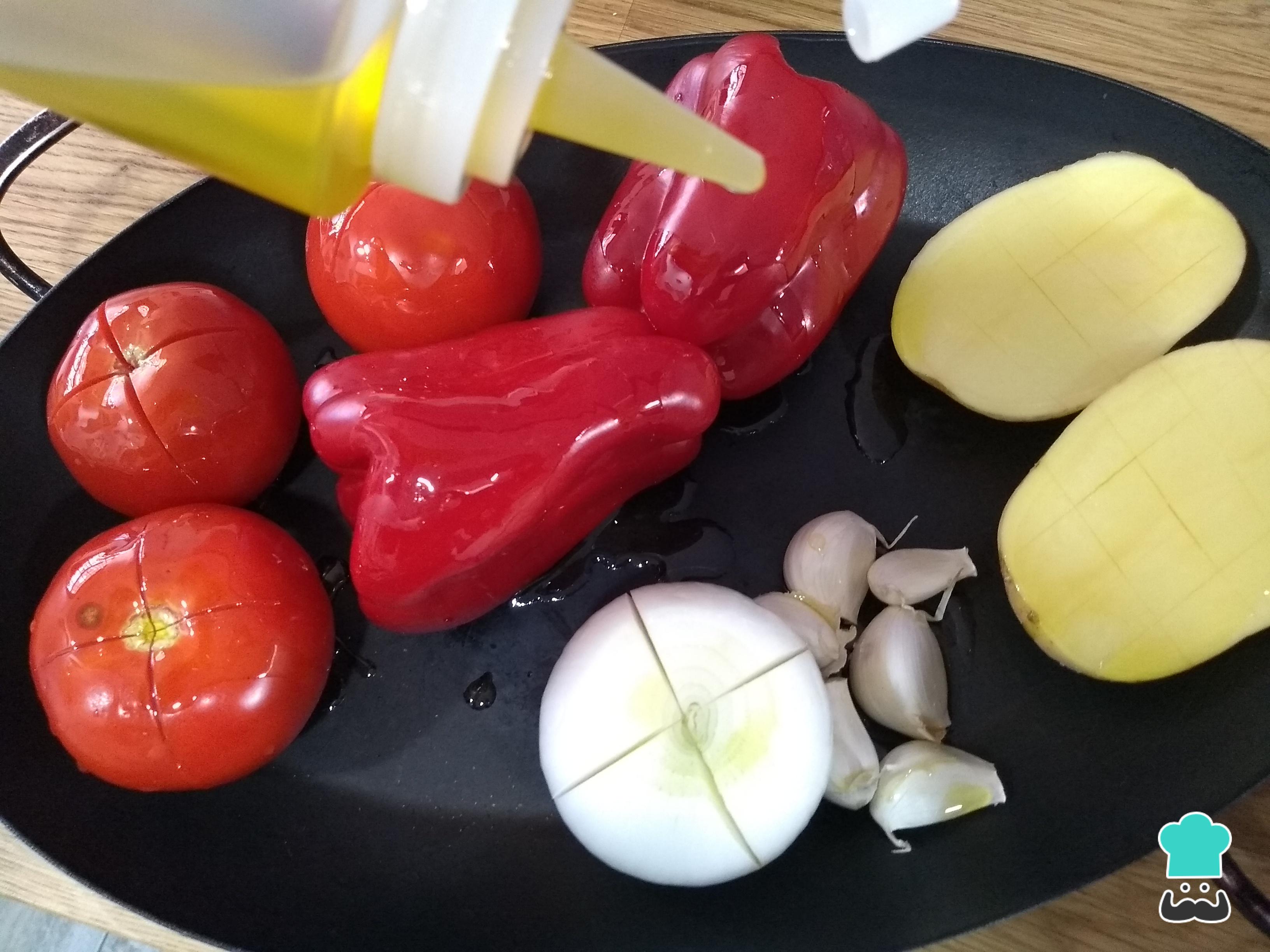 Enciende el horno a 200 ºC con calor arriba y abajo para que se vaya calentando. Limpia bien las verduras y la patata porque el asado va a ser con su piel. Una vez limpio todo, prepara una fuente de horno o bandeja y pon los pimientos, la patata cortada por la mitad y con cortes en la pulpa en forma de enrejado, los tomates con un corte en cruz en la parte superior para que después sea sencillo extraer su piel, la cebolla pelada y con un corte en cruz arriba, los dientes de ajo con su piel, echa un chorrito de aceite a cada verdura e introduce la bandeja en el horno para asar los vegetales durante 45 minutos, dándoles la vuelta transcurridos 15 minutos.