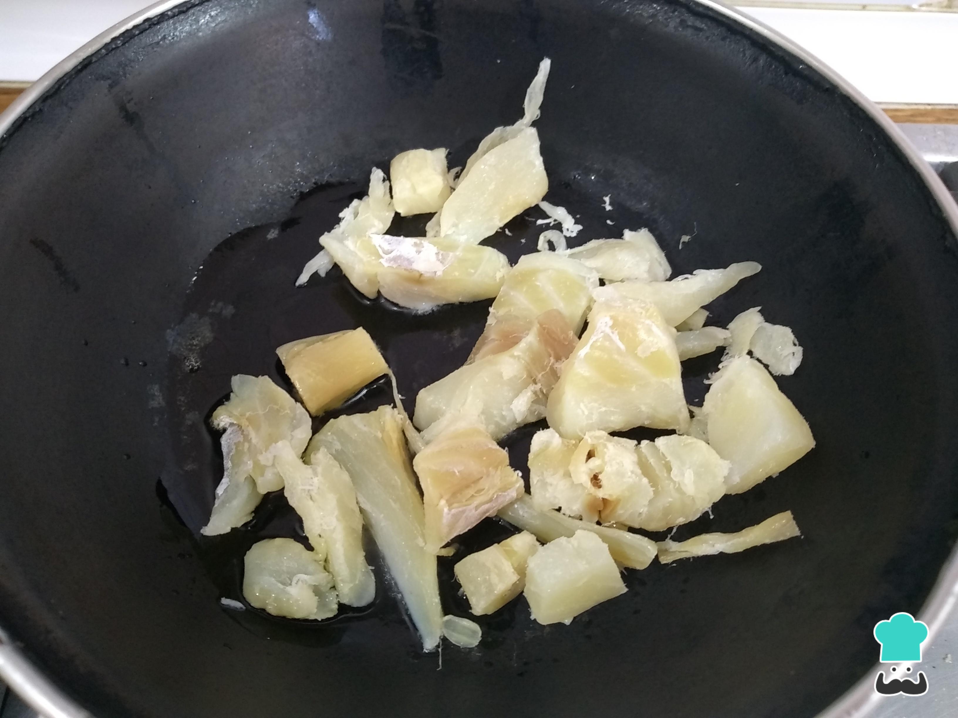 Vierte un poco de aceite en una sarten y saltea las migas de bacalao durante un par de minutos. Saca el pescado de la sartén y resérvalo. Si lo deseas puedes utilizar bacalao seco y desalarlo tú en casa.