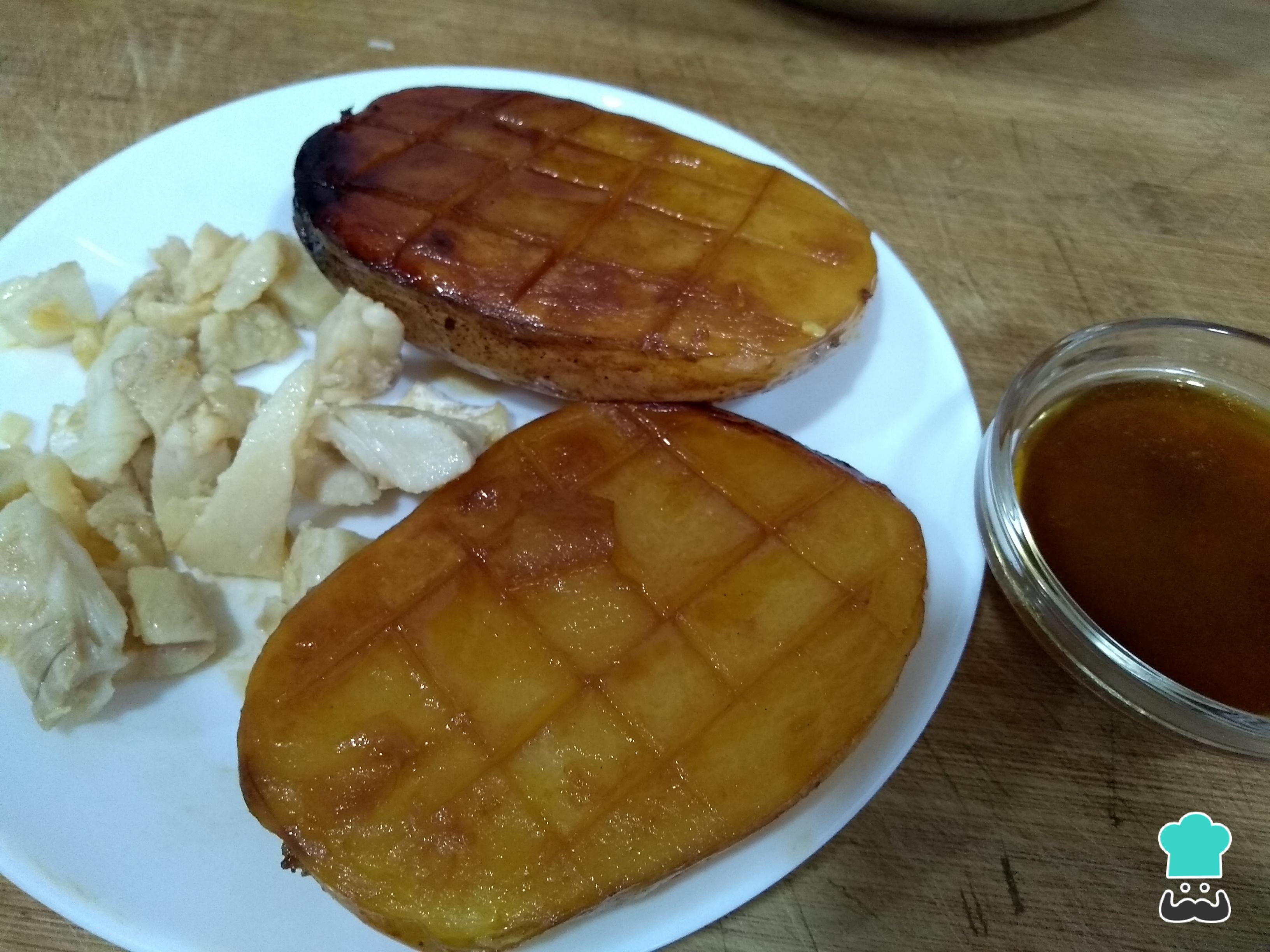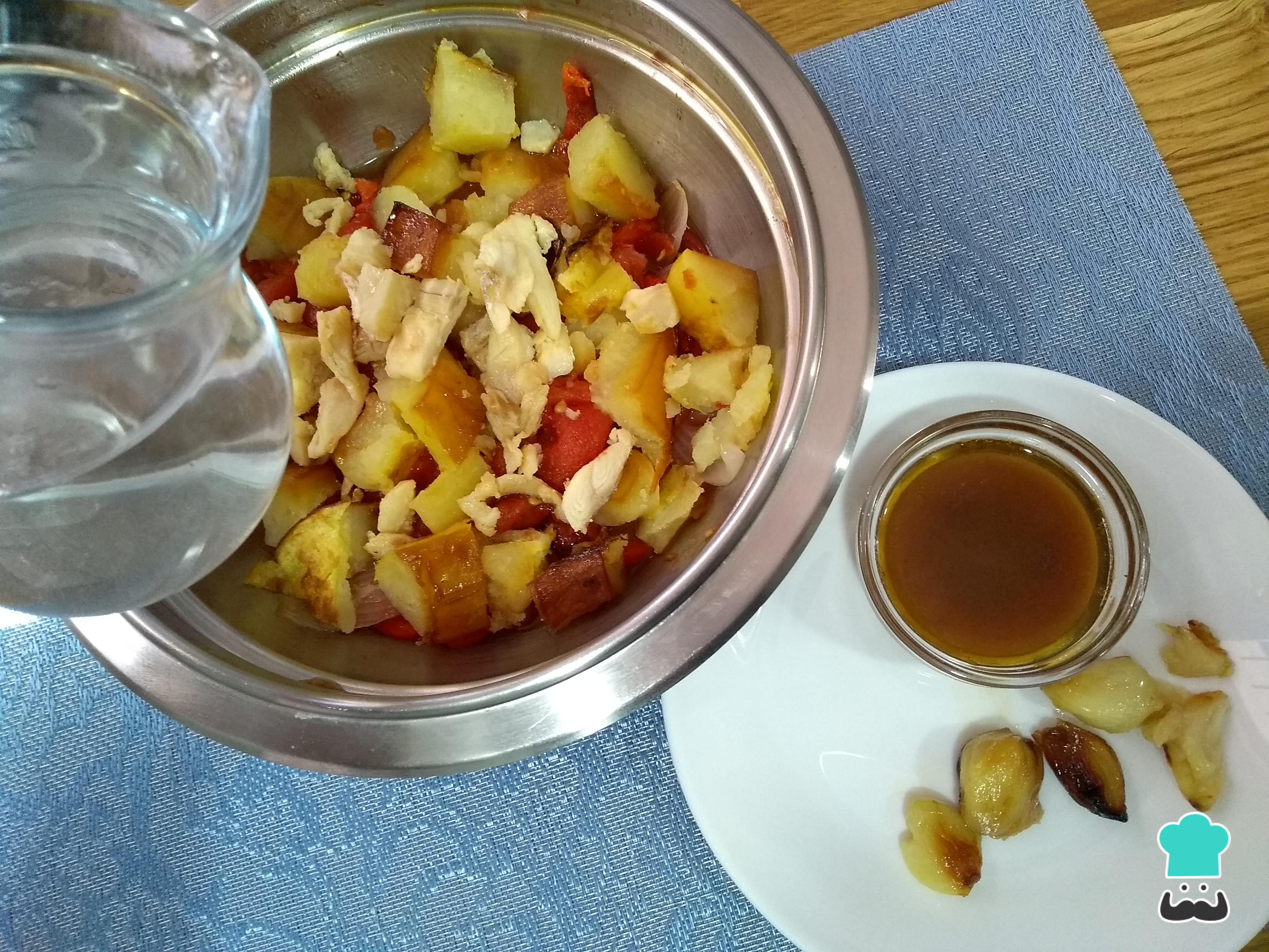 Extrae todo el jugo de la bandeja de asar y consérvalo porque ese jugo lo utilizarás en los últimos pasos de la receta de tiznao manchego. Una vez pelada la patata, córtala en aproximadamente 6 trozos por cada mitad.