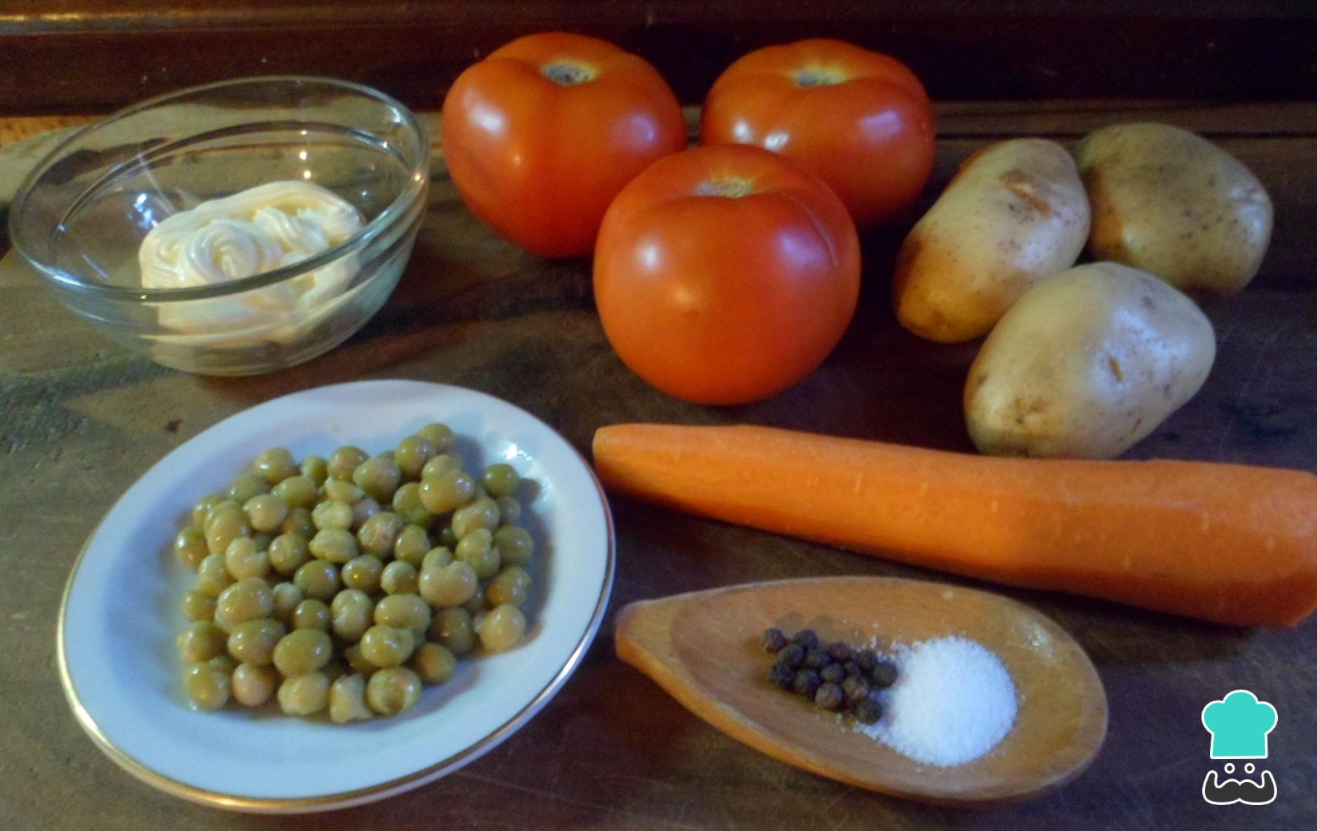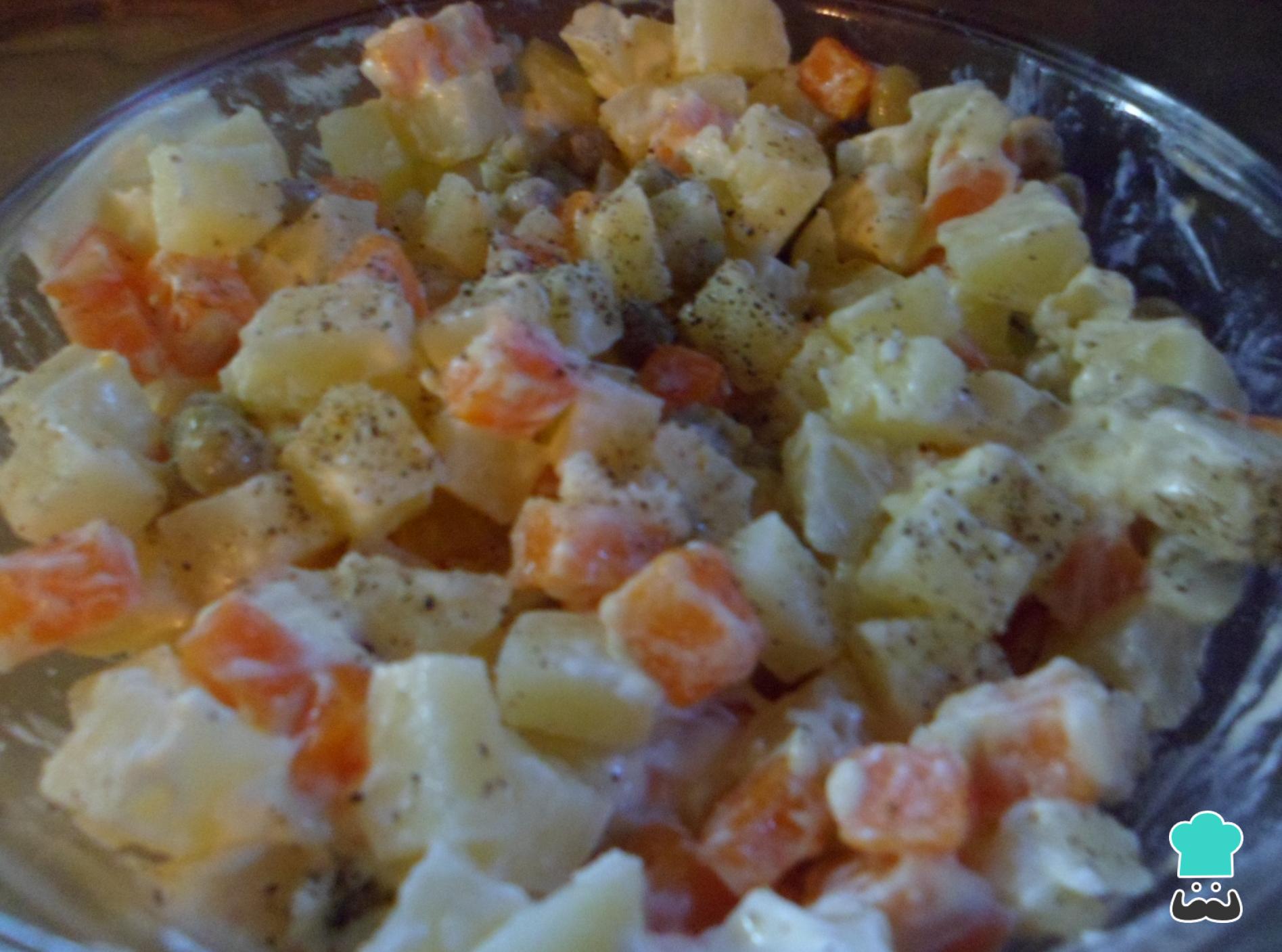 Por otro lado, cortamos las papas en cubos. Para los tomates rellenos, es necesario cortar, las papas y las zanahorias más pequeñas que en una ensalada rusa tradicional.