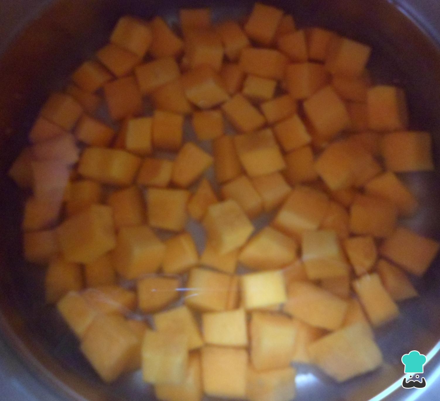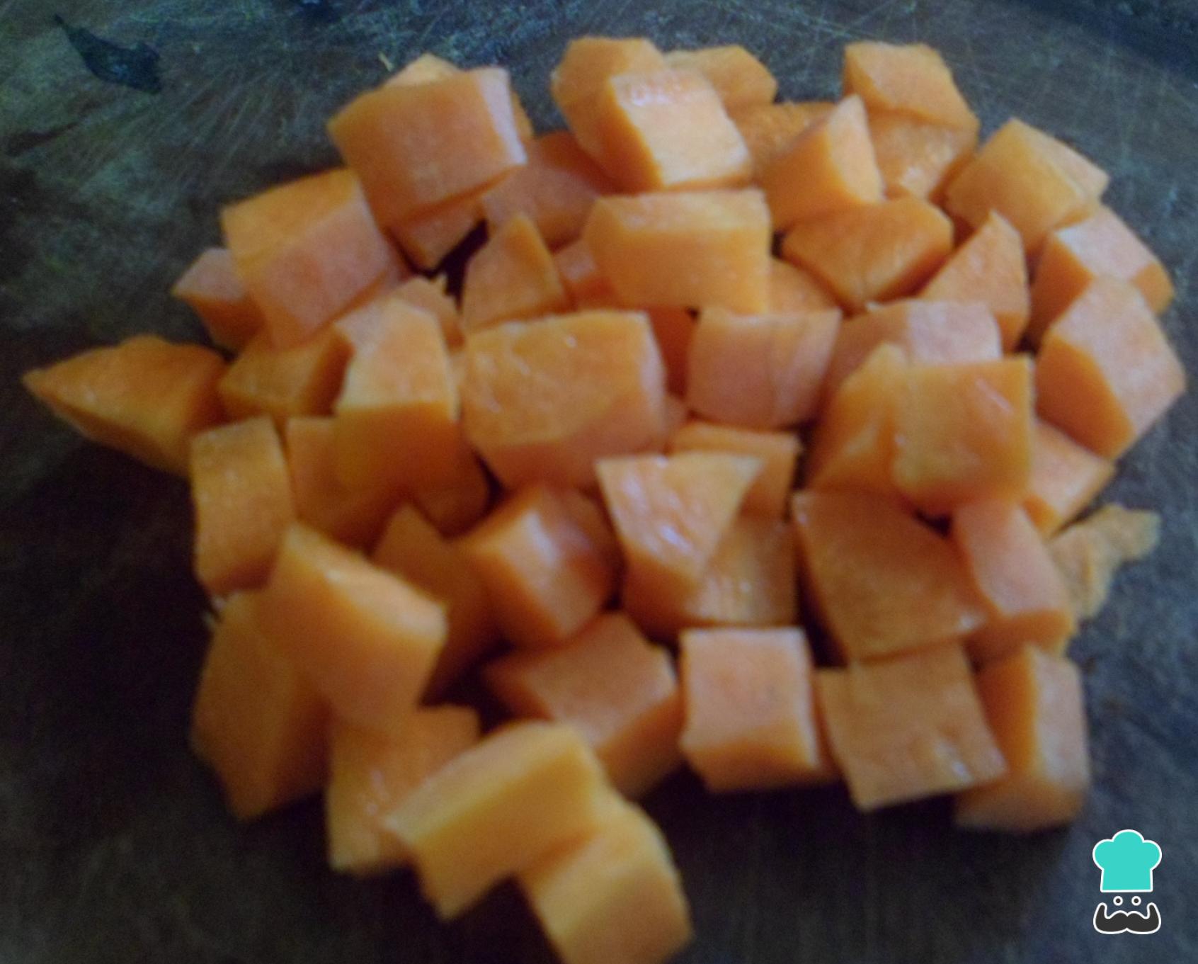 Colocamos la zanahoria cortada en una olla con agua y sal. Cocinamos hasta que esté tierna. Debemos tener en cuenta que la zanahoria tenemos que cocinarla por separado, ya que éstas requieren unos 2 ó 3 minutos más de cocción que las papas.