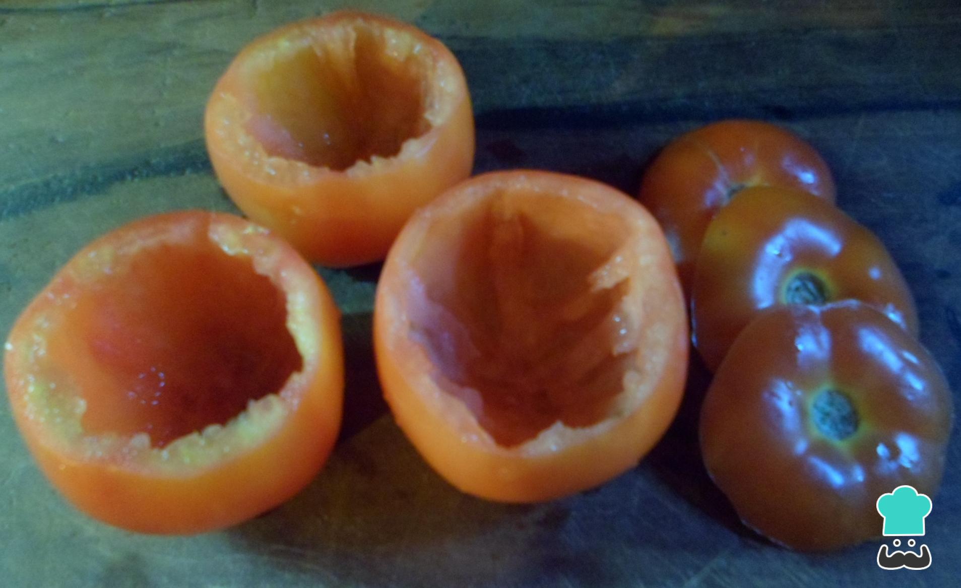 Mientras se van cocinando los ingredientes para los tomates rellenos, los vamos ahuecando de esta manera: cortamos la tapa superior de los mismos y les quitamos toda la pulpa con una cuchara, teniendo cuidado que no se rompan.