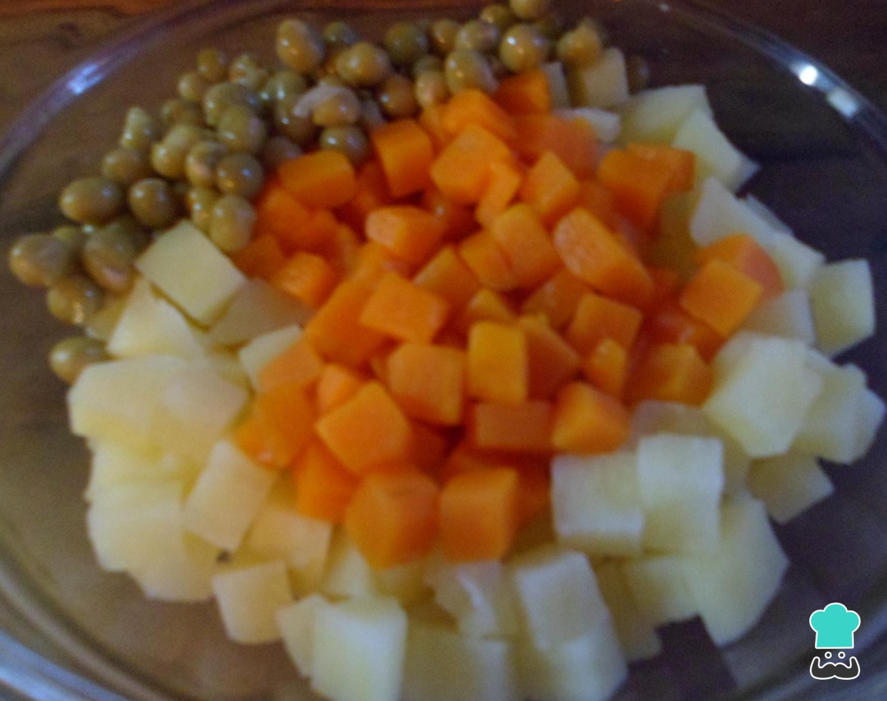 Tomamos un bowl y colocamos las papas y la zanahoria cocidas junto con las arvejas.