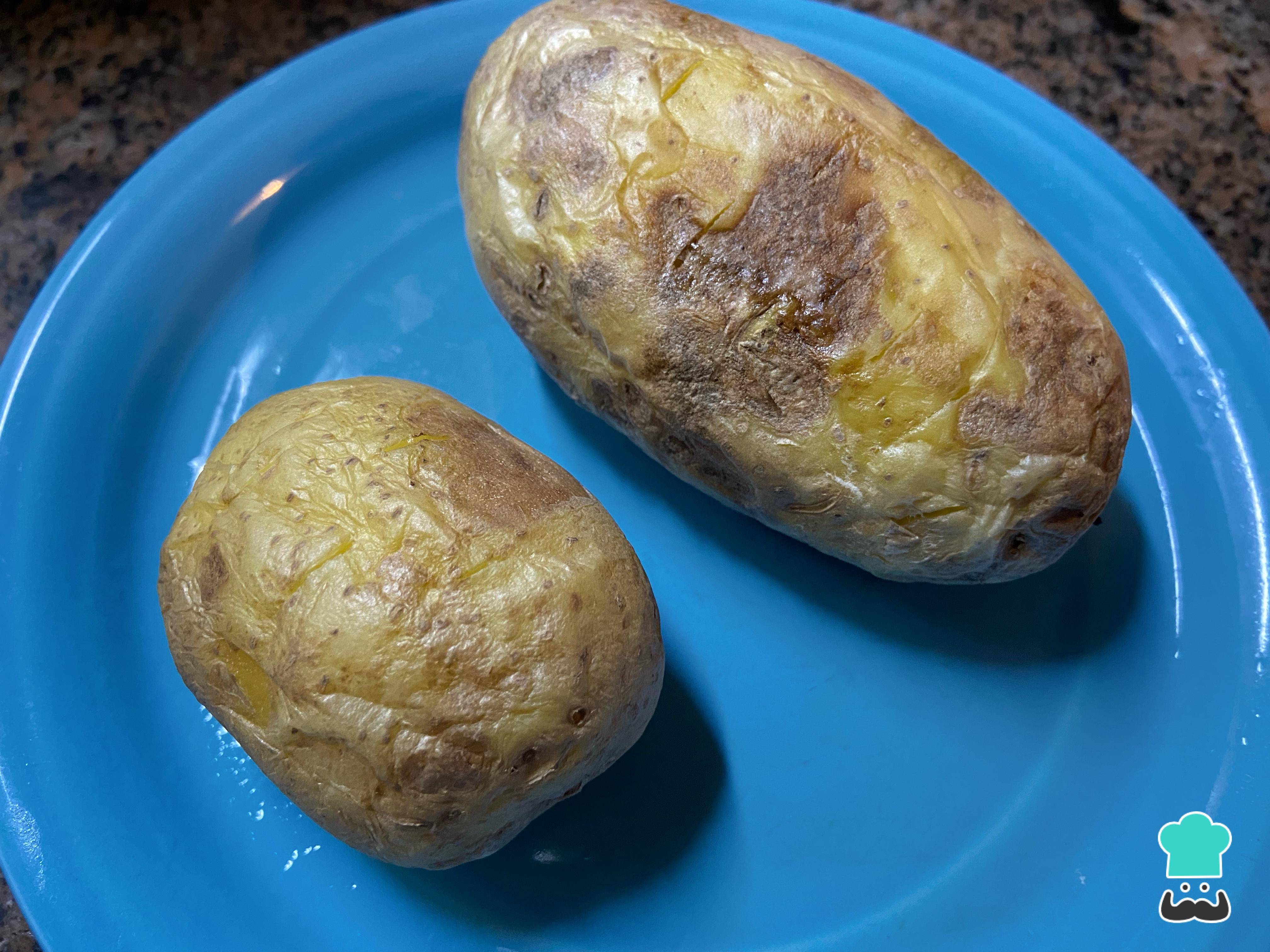Empieza la receta de torrejas de espinaca sin harina cocinando las papas. Para ello, límpialas con un cepillo exclusivo para alimentos y pínchalas con un tenedor o cuchillo para cocinarlas en el microondas durante 3 minutos. Gíralas y cocínalas 3 minutos más. Resérvalas mientras se enfrían.