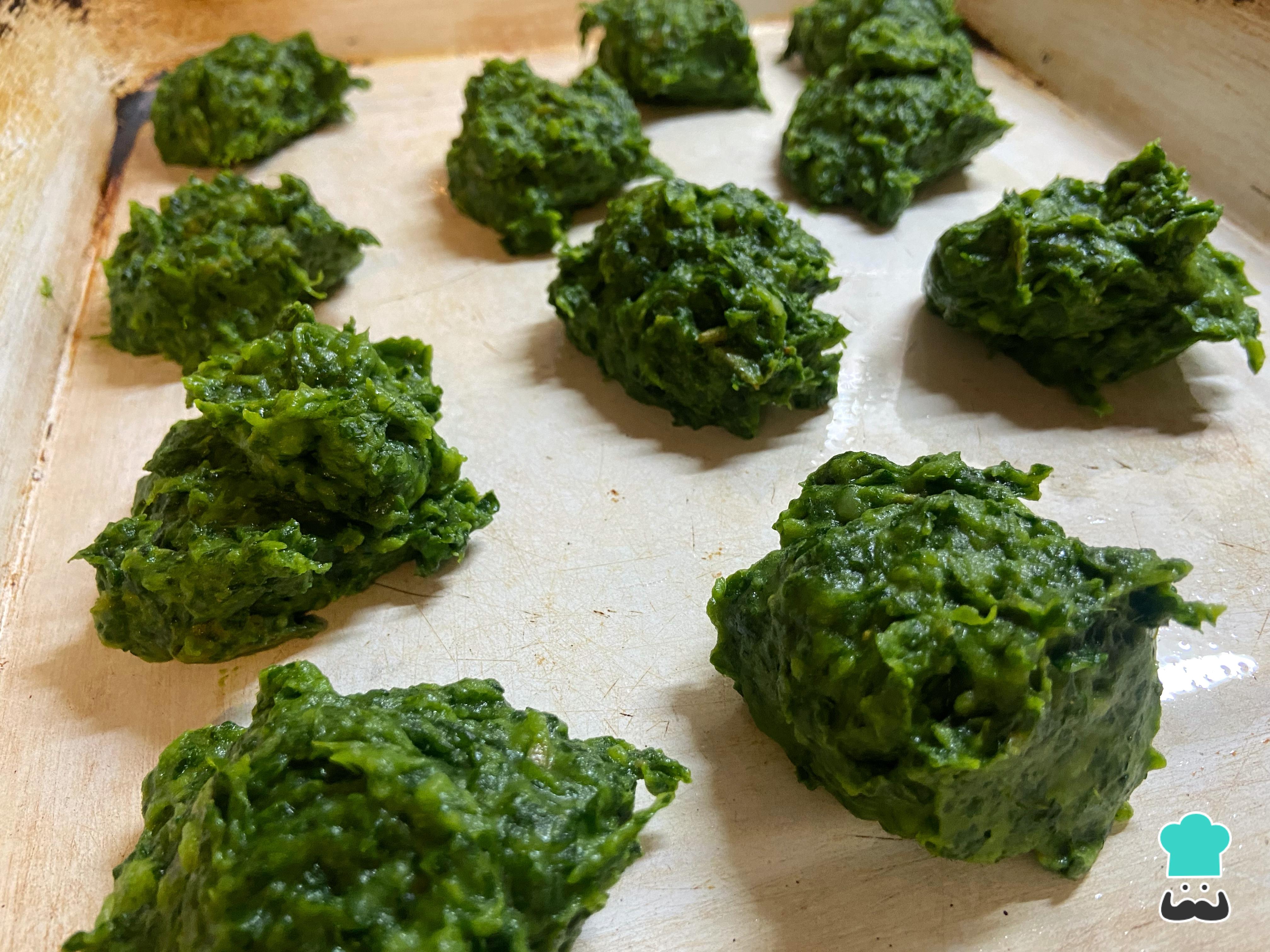 Enciende el horno a temperatura máxima para que se caliente. Cuando hayan pasado los 15 minutos, toma cucharadas de la preparación y llévalas a una asadera previamente engrasada para formar tus torrejas de espinaca sin harina.