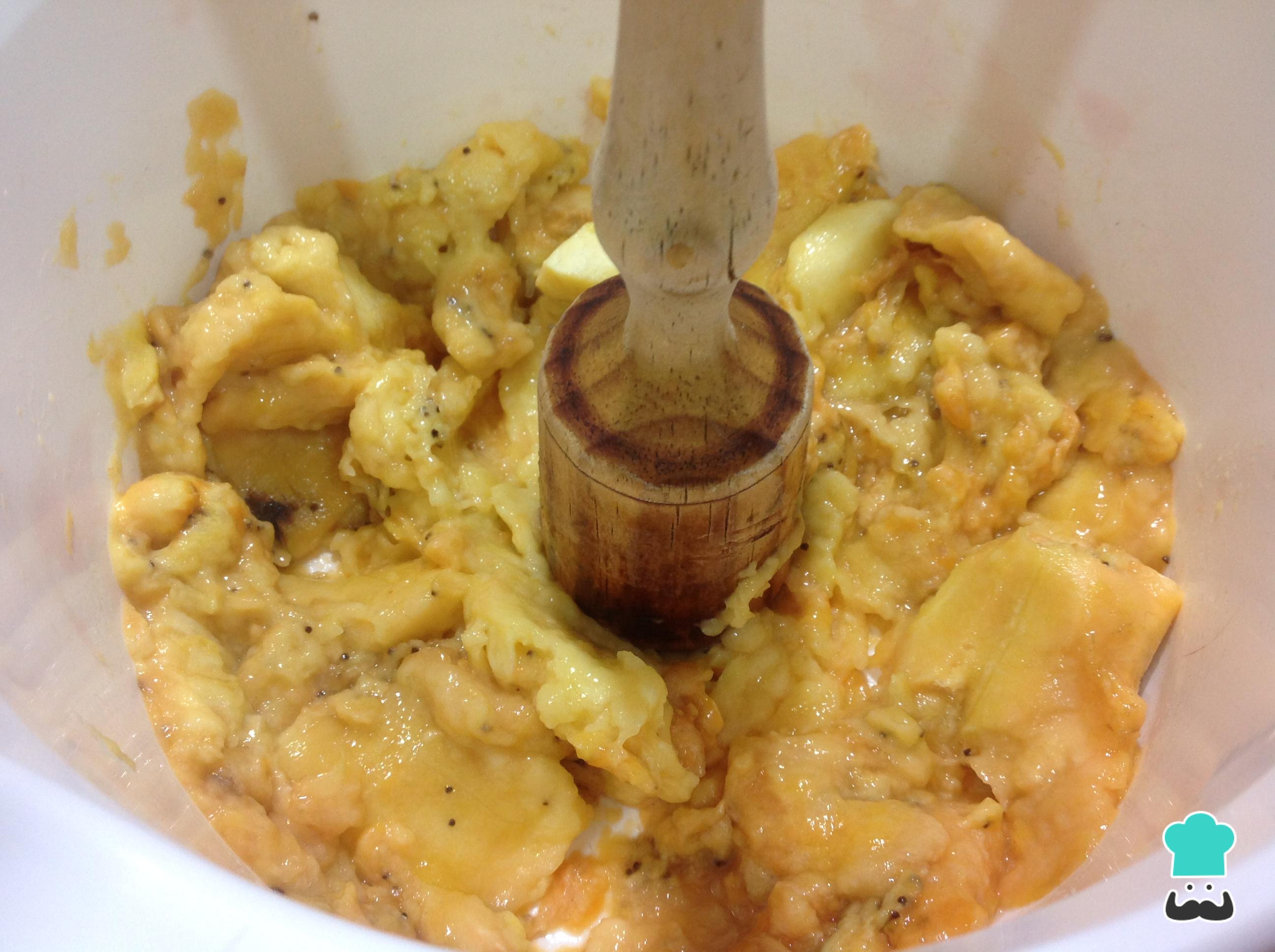 Quitamos las cáscaras a los plátanos, los colocamos en un recipiente y los machacamos hasta que quede un puré de plátano.