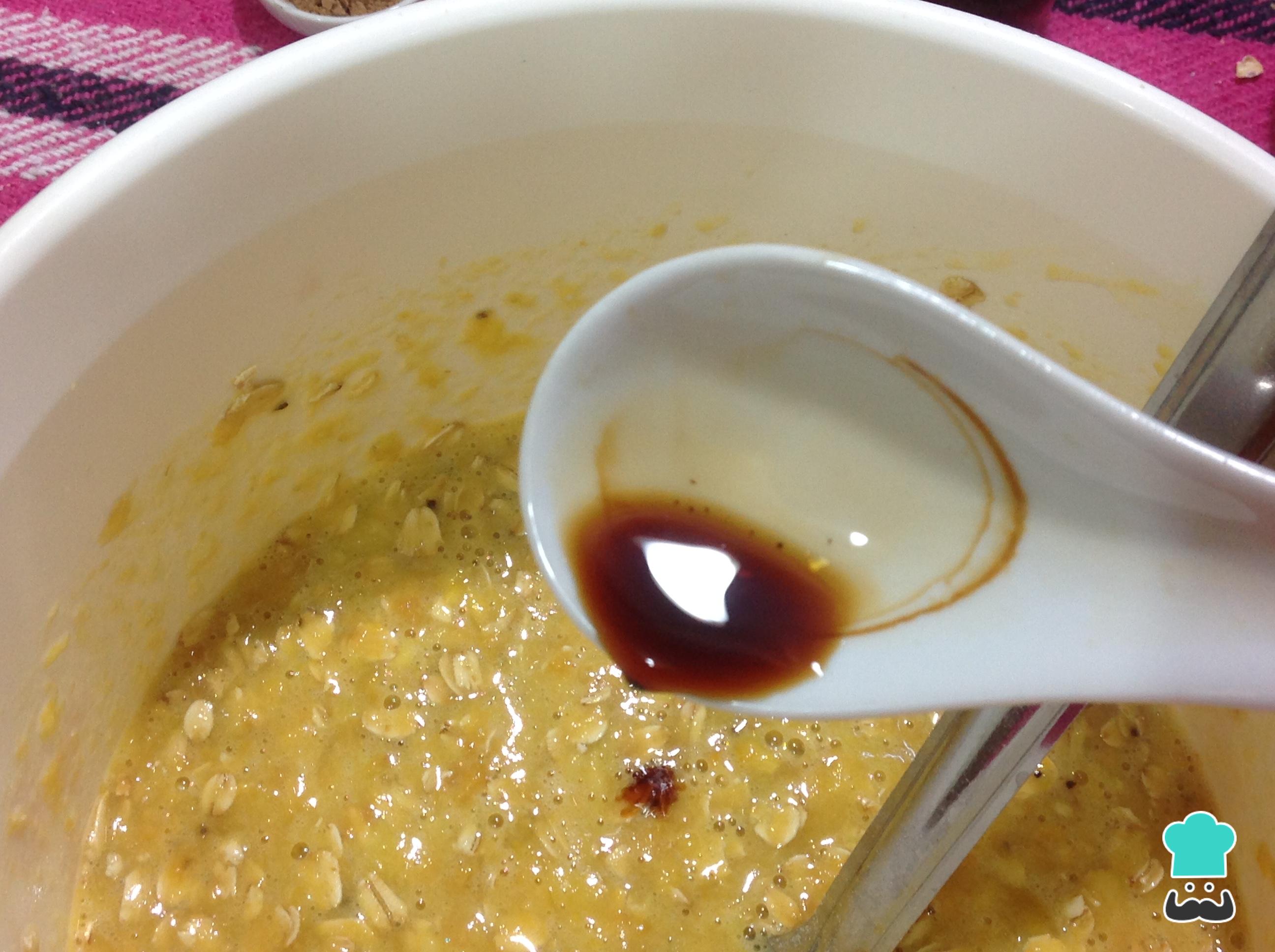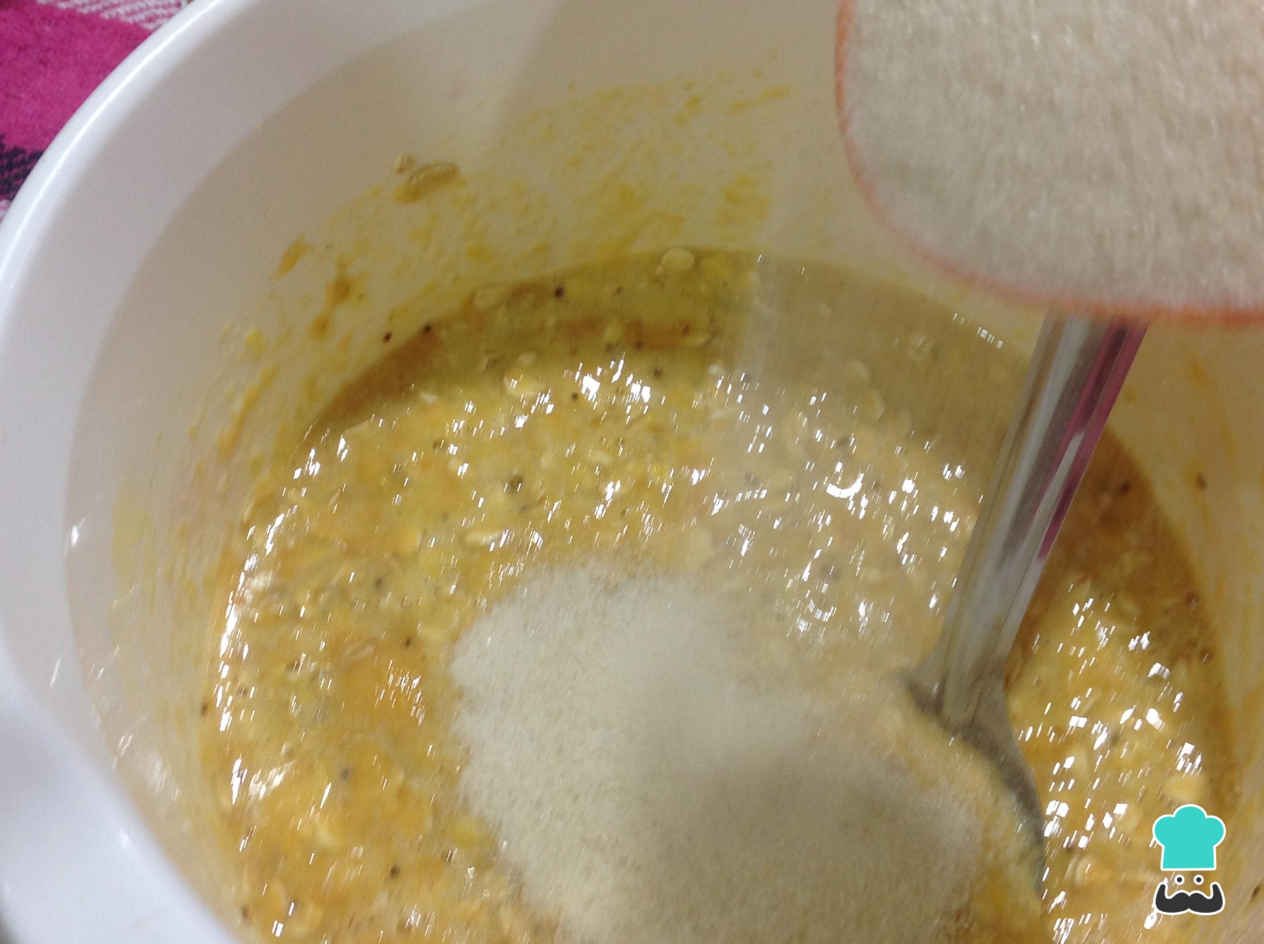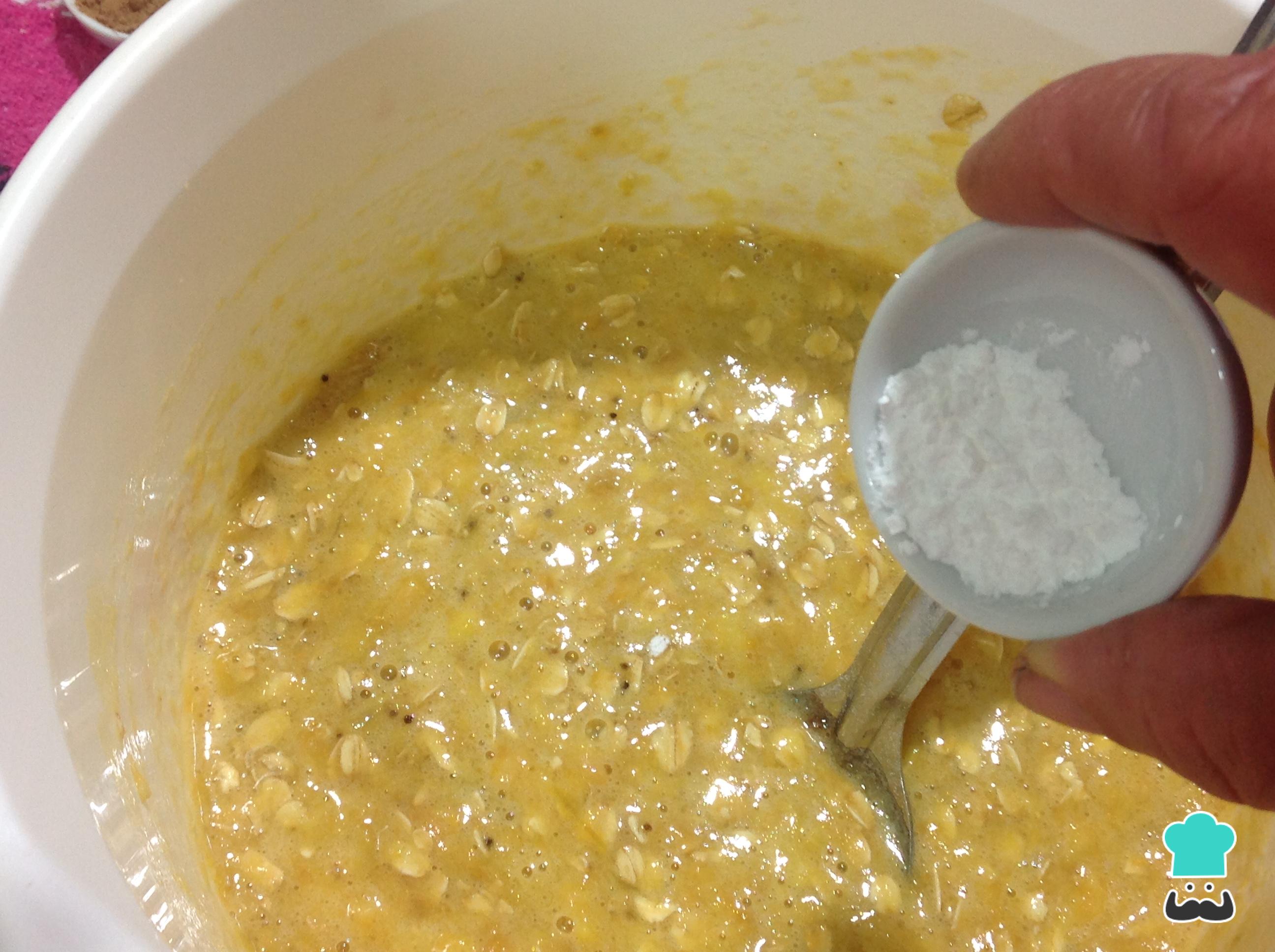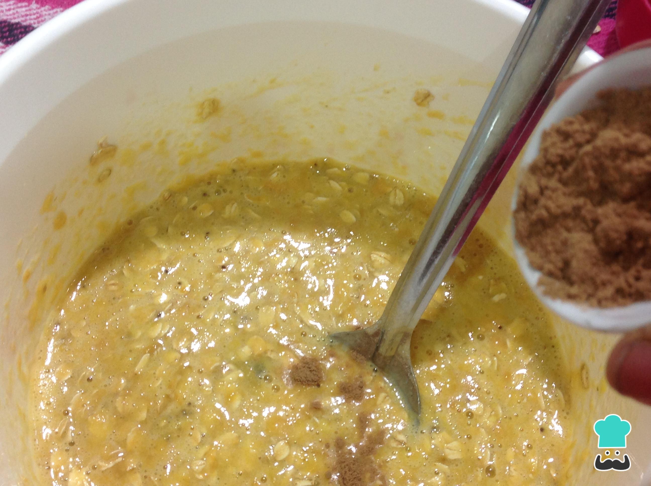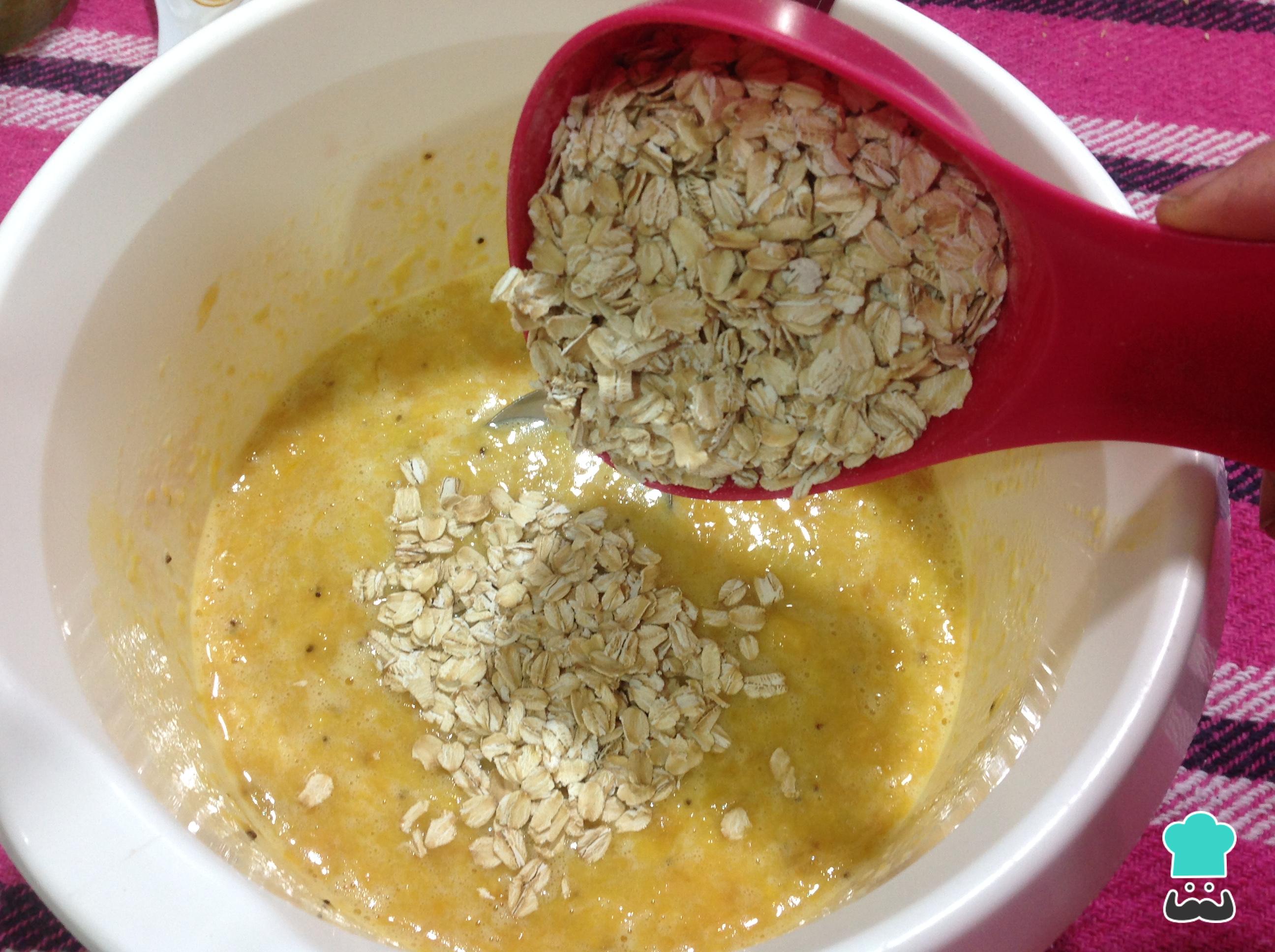 Ahora, vamos a agregar la avena y batir para que se integre bien con el resto de ingredientes de las torrejas de plátano.
