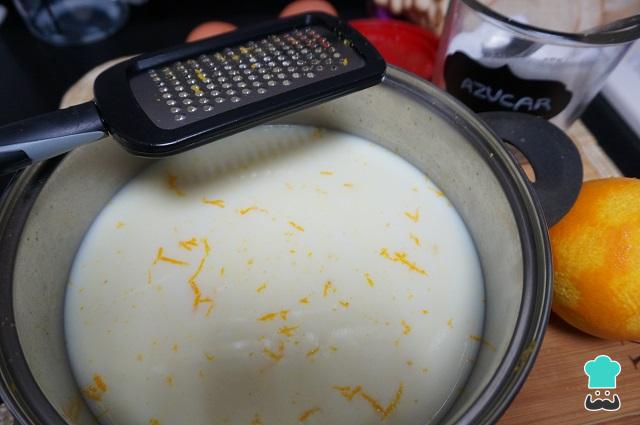En un cazo ponemos la leche, la ralladura de dos naranjas, 4 cucharadas de azúcar y el zumo de 1/2 naranja. Si os gusta más fuerte se puede añadir más zumo de naranja. Lo ponemos todo a cocer y vamos removiendo para que la leche coja todo el sabor de la naranja. Cuando empiece a hervir apagamos y dejamos templar.