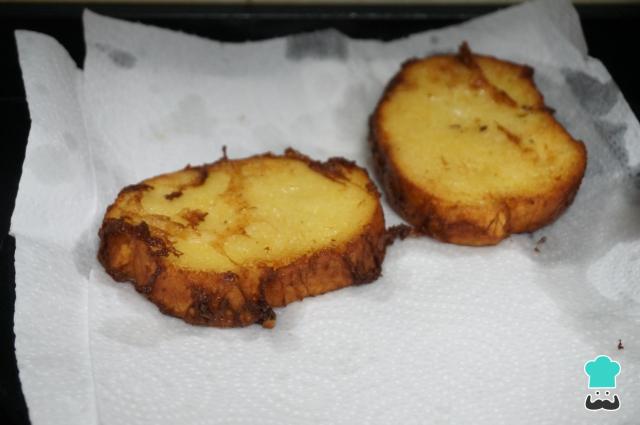 Coloca papel de cocina en una fuente o plato. Retira las torrijas cocinadas y colócalas sobre el papel absorbente para que suelte todo el aceite sobrante.