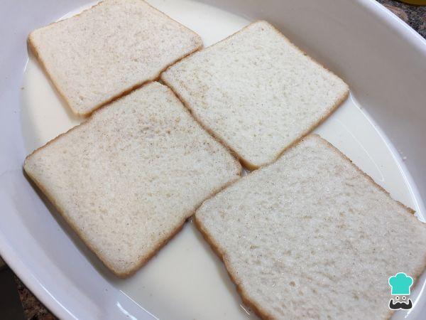 Cuela la leche infusionada en un plato y empapa las rebanadas de pan de molde dentro por ambos lados.