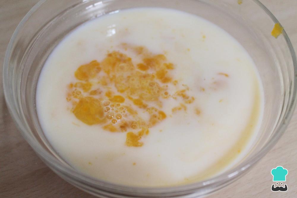 Si te preguntabas cómo hacer torrijas canarias, aquí tienes la receta ideal. Para empezar, bate el huevo en un recipiente e incorpora el puré de calabaza junto con la leche. Mezcla hasta que se integre todo bien.