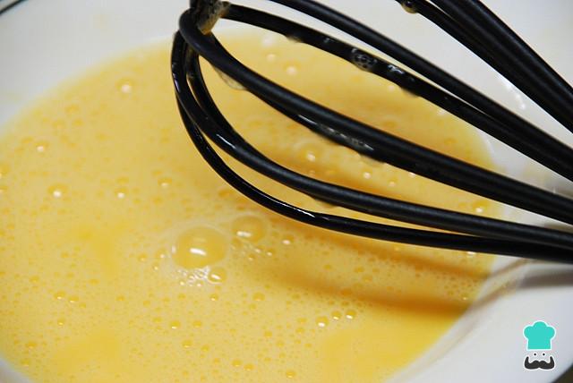 Bate los huevos y añade el aceite de girasol para freír en una sartén a calentar.