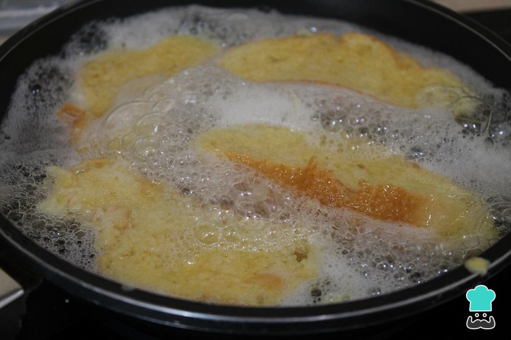 Ponemos en una sartén amplia un buen chorro de aceite de girasol para que cubra casi por completo las torrijas de Santa Teresa. Cuando el aceite esté caliente, batimos los huevos ligeramente y pasamos las torrijas por el huevo (mejor una a una y las iremos metiendo seguidamente en la sartén) Manipularemos las torrijas de pan con cuidado pues estarán muy blanditas.