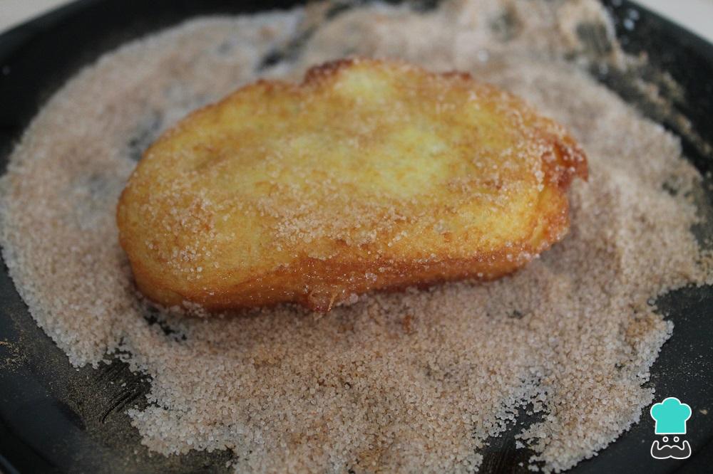 Truco: si pasamos las torrijas de pan frías por el azúcar y la canela, apenas se va a adherir en ella, por eso es mejor siempre que estén aún calientes.