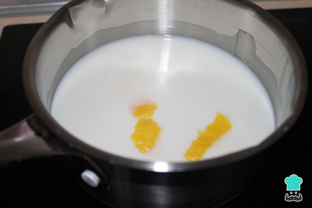 Calienta en un cazo la leche desnatada, la piel del limón, la esencia de vainilla y la stevia. Cuando rompa a hervir, retira la preparación del fuego y deja enfriar del todo con una tapadera para que la leche se infusione.