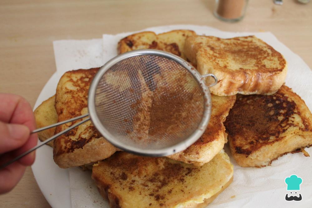 Pon las torrijas sin azúcar en un plato con papel absorbente, tanto si las has hecho a la plancha como si las has cocinado al horno, para retirar el posible exceso de aceite. Para potenciar el sabor de tus torrijas, espolvorea con canela en polvo o prepara almíbar para las torrijas sin azúcar, es decir, con tu edulcorante favorito.