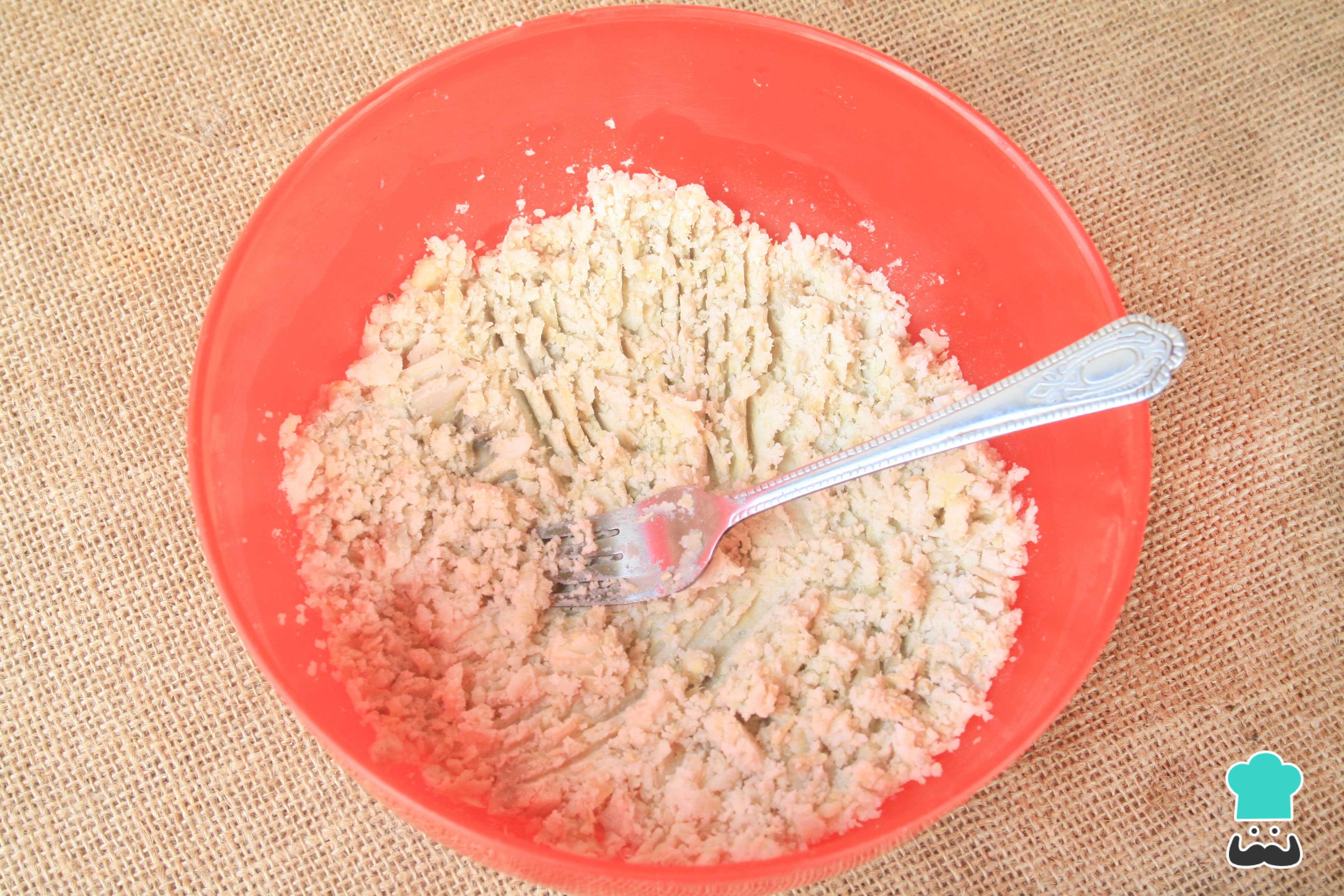 Tritura las batatas (boniato, camote) hasta crear un puré. La consistencia debe ser suave pero firme. Reserva para seguir con la receta de torta de batata sin harina.