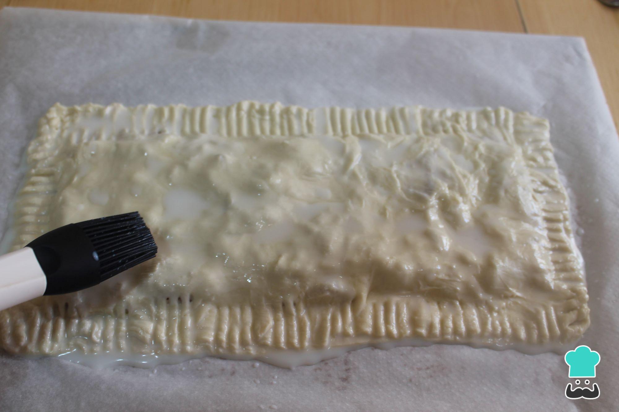 Pincela todo ese centímetro de masa alrededor del cabello de ángel con leche y cubre todo con la otra mitad de hojaldre que tenías reservado.