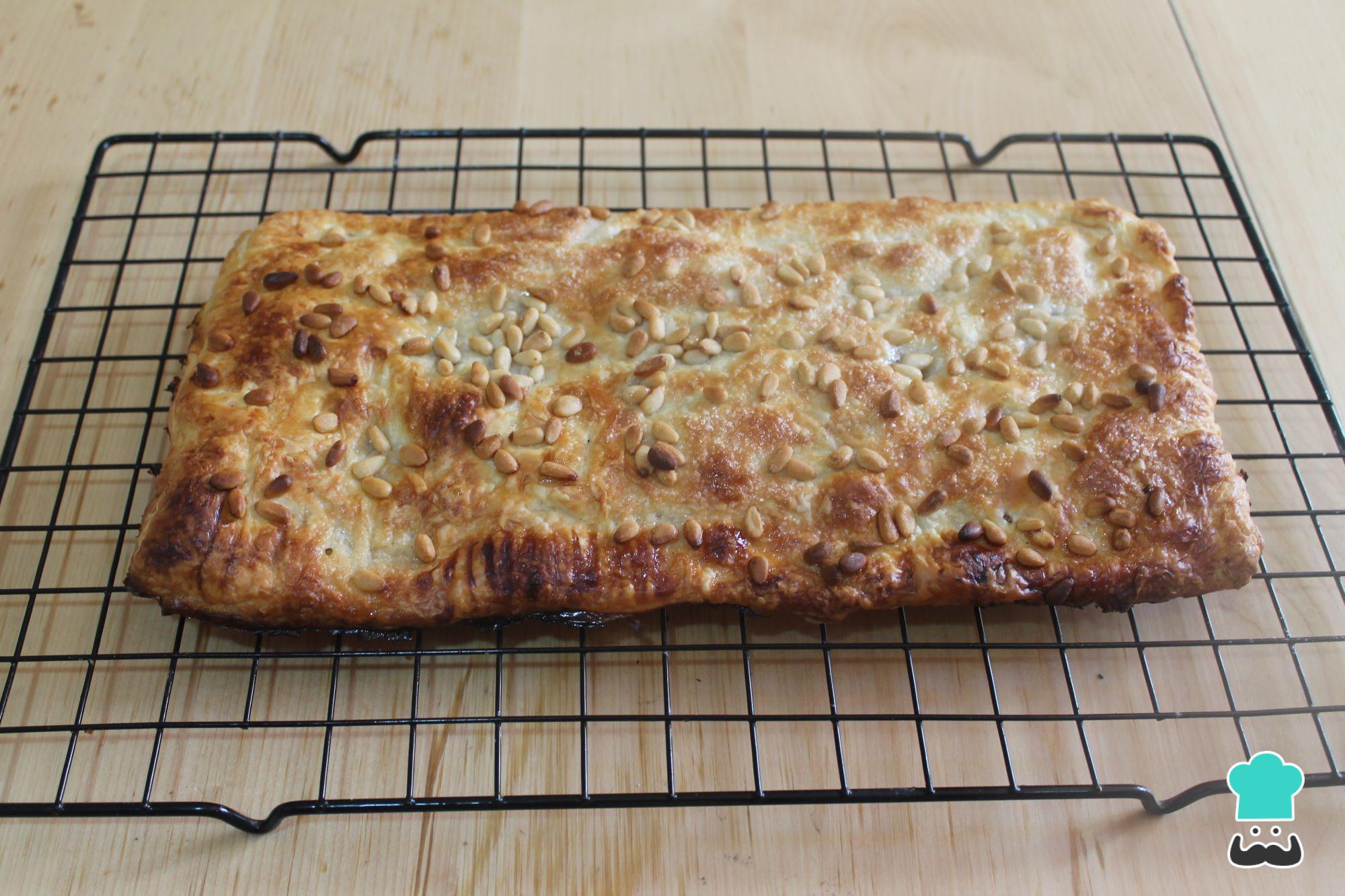 Cuando esté dorada la coca de hojaldre con cabello de ángel, retira del horno y deja enfriar encima de una rejilla.