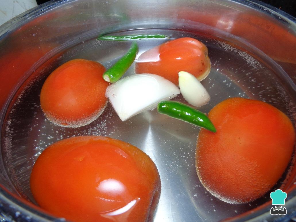 Vamos a comenzar preparando nuestra rica salsa para los chilaquiles de esta torta: para ello tomamos los tomates rojos, junto con la cebolla, el diente de ajo, los chiles y los colocamos en una cacerola con agua hirviendo dejándolos aproximadamente 10 minutos para que se cuezan perfectamente.